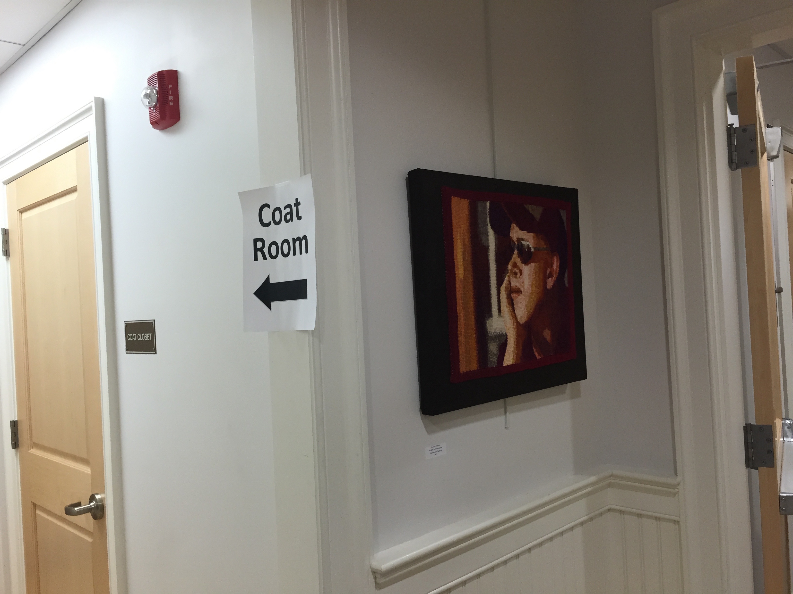 Looking back at my admittedly narrow experience in showing fiber works in public spaces, I’ve been quite fortunate to be part of exhibitions in large spaces that allowed such very different techniques to be seen to good advantage. I guess it takes a bad experience to better appreciate the good ones. Meanwhile, for the next month my tapestry of the sunset on my son’s face can greet people as they retrieve their coats and visit the ladies’ or the men’s….. (snark)…