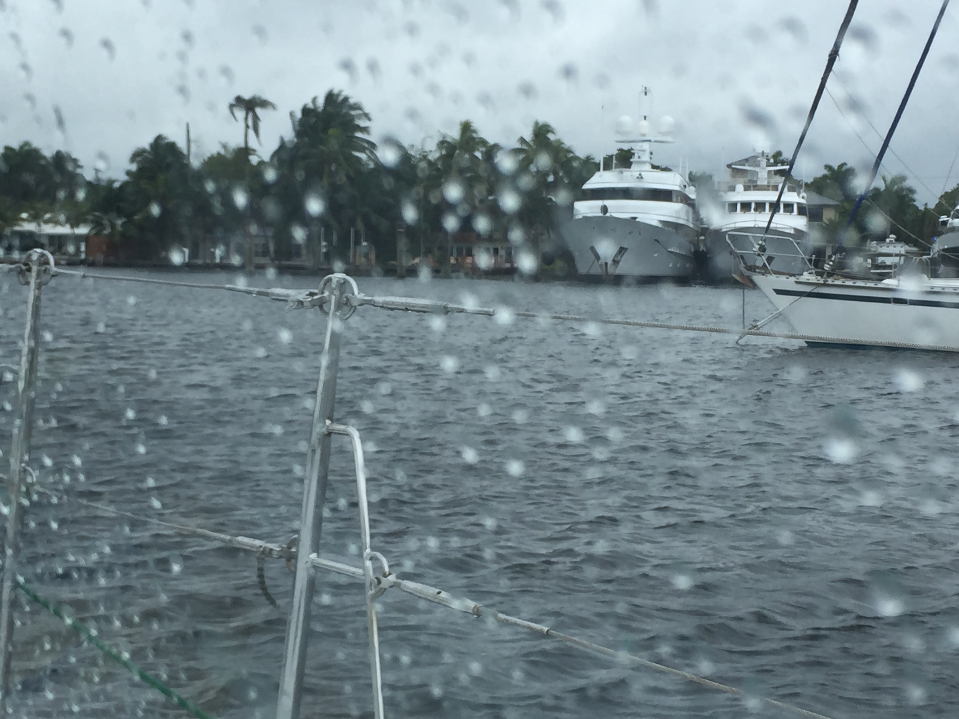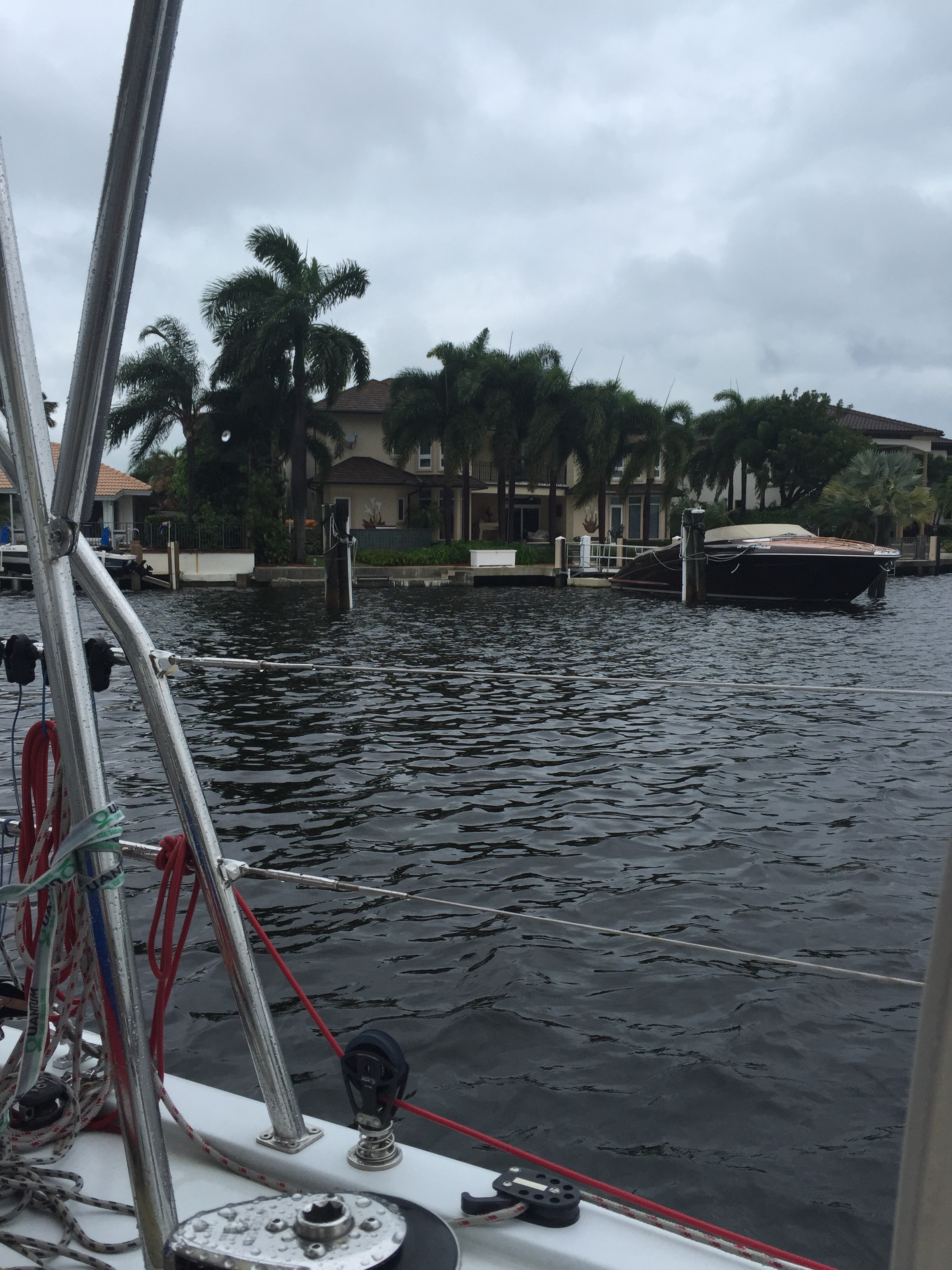 We are anchored in a little ‘teacup’ harbor called Middle River, in Ft. Lauderdale. It is surrounded by elegant, Florida-style mansions, and each house has a dock with a large powerboat tied up to it. There are too many of us cruising sailboats anchored in the middle of this little teacup, and when the winds are this strong no one feels safe. All the boats are on the verge of tangling so no one got any sleep last night—perhaps Bob and me most of all since we dragged rather dramatically in the late evening. It was odd because we’d already been here overnight with no incident. This anchor has surprised us twice now so we did not sleep worrying about dragging yet again. Anyway, no loss of life, and no damage to anyone—but until this front gets through here we will not feel safe. If any of us should drag too far we will be tangled with the large mega yachts on the docks.