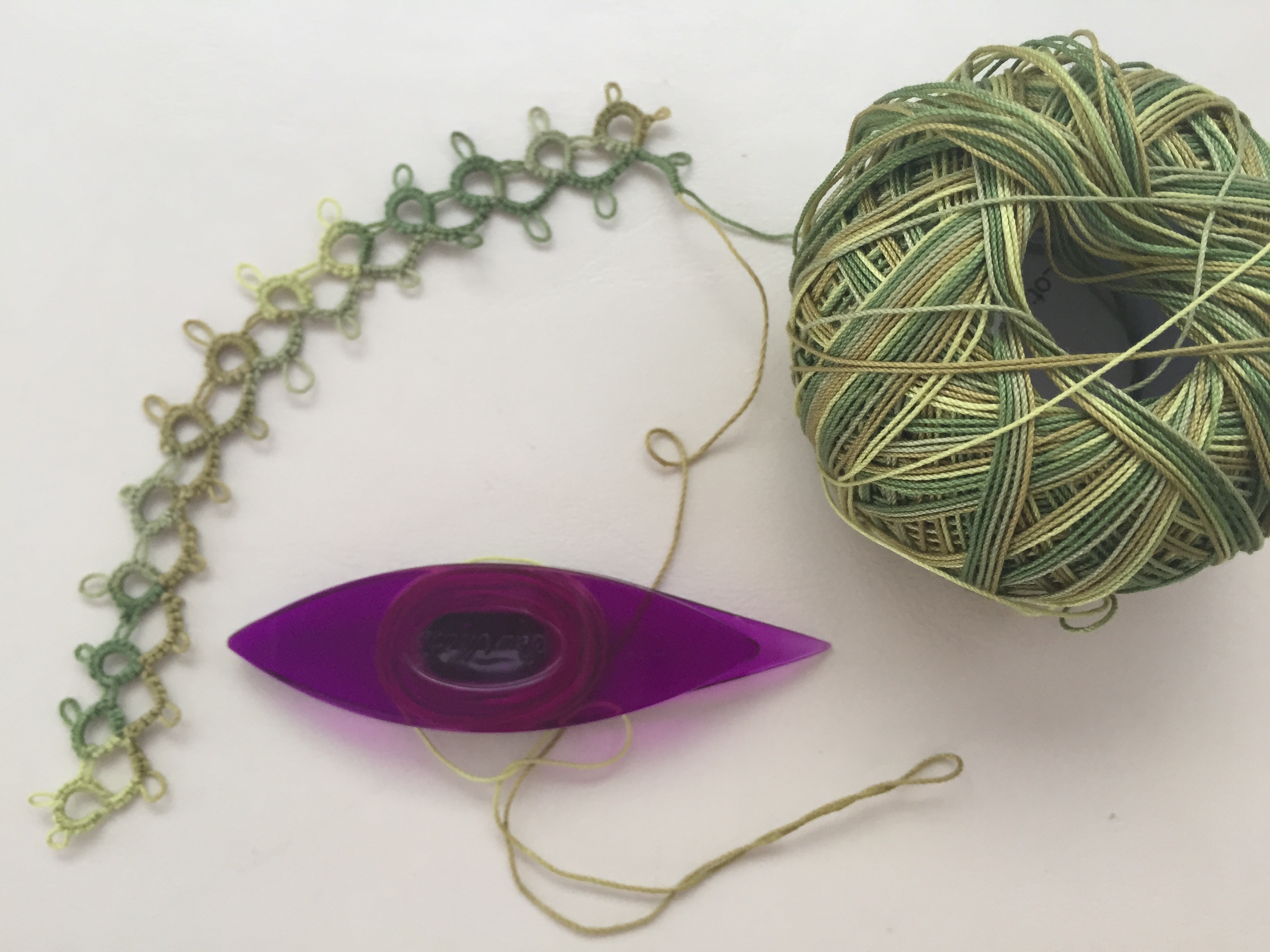 I have to thank my lace guru Mary for showing me the fundamentals of tatting (she’s not the first, but clearly the most successful at getting me to understand!), and I hope she will not take it as a slur against her teaching if she ever sees this pathetic little length of lace. I just know that someday it’s going to feel natural to do this. I have a memory of seeing my great aunts’ hands flashing back and forth as their tatting grew while I watched. Surely, it’s in my DNA somewhere.