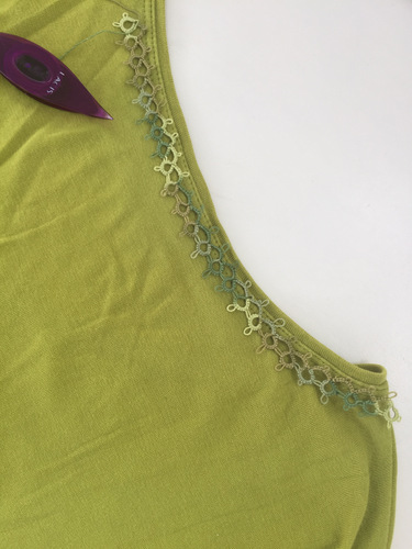 While we are waiting for the weather window to sail to the Bahamas, I’ve been slowly honing my tatting skills. I’m definitely improving…and now I’ve got enough tatting to go across the back of my green T-shirt and start going down one side of the front V-neck! Only about a million more little rings and chains to go!