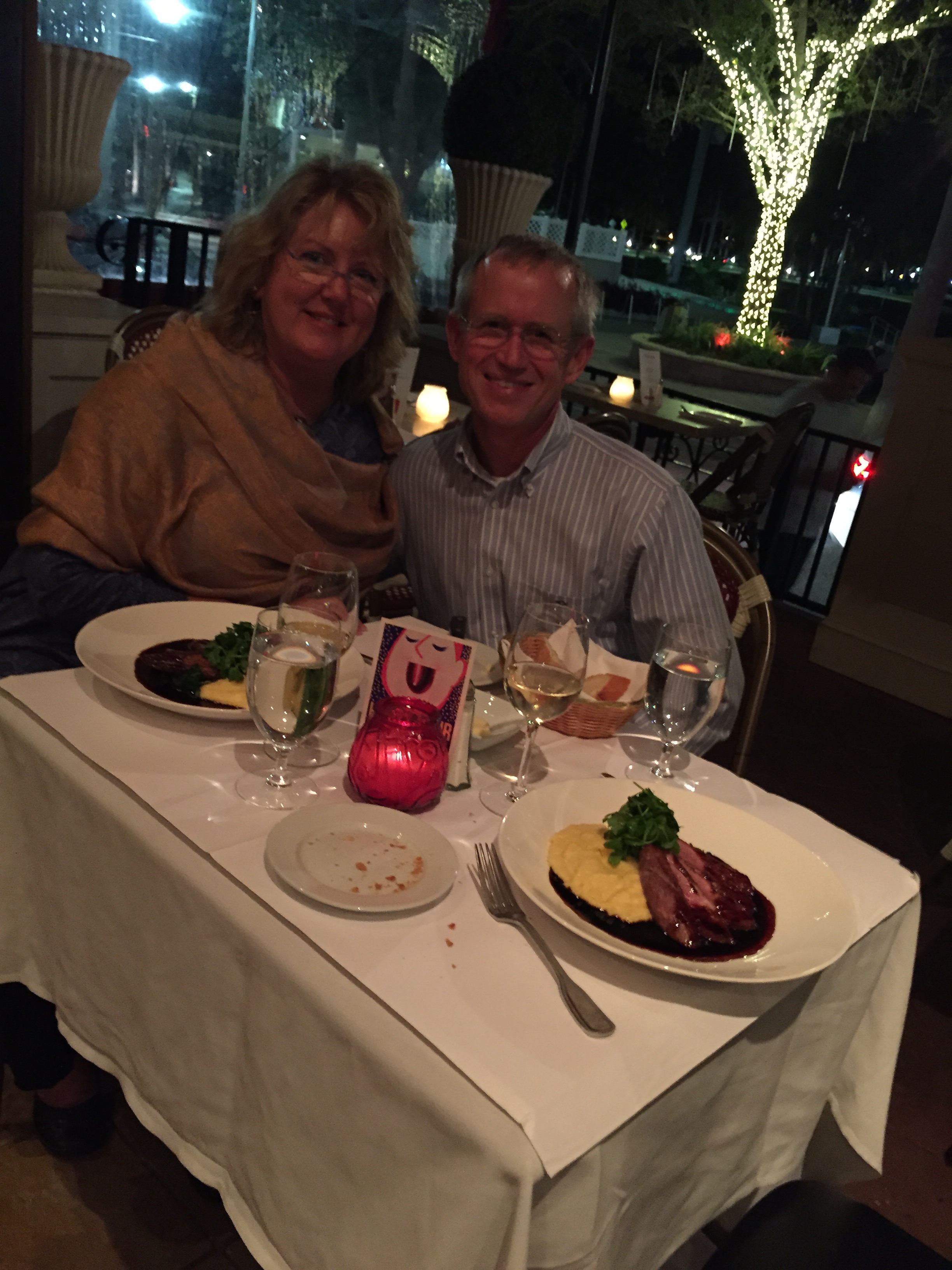 A few days before my real birthday last week, Bob and I had a marvelous dinner at Pistache in West Palm Beach. This photo is all about the dinner: duck breast in cherry sauce with truffle polenta…and the harbor park in the background.
