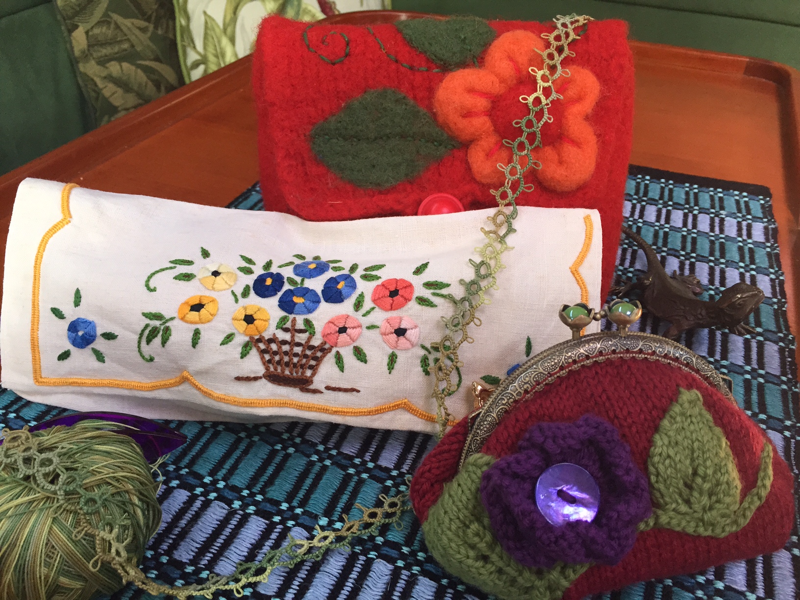 And speaking of tatting—I just love having beautiful accessories for all my projects. I have some wonderful, handmade bags that people have given me over the past few years, and I love to keep my little projects in them. The felted bag is from Latvia. The embroidered bag is new this week! It’s from France and was sent to me by a wonderful friend in England who knows how much I love special little textiles of any sort. It’s very special to me, and now it holds my tatting project. The knitted bag is also new, and was given to me as a kit by another friend who knows me well. She knew I’d love the bag, and she also knew I’d want to knit it and embellish it myself.