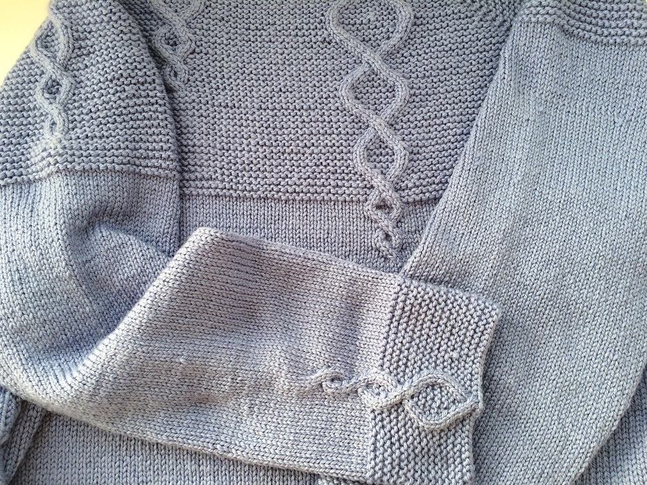 Today I cast off the last stitches on the Finnish Sweater with the asymmetrical cables, and racing down the last sleeve, the bind off came as a shock to me. I had no idea I was that close to done. I must’ve been knitting with blinders on.