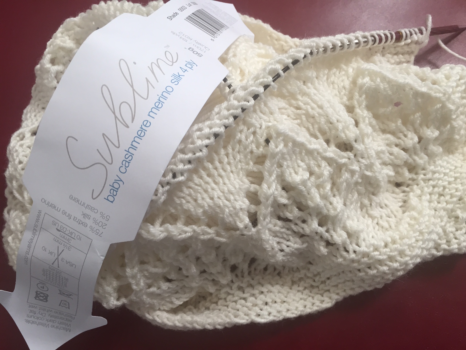 Meanwhile, as I ponder what to do about that threading, I’ve been knitting and doing some Idrija lace on a bolster pillow. I don’t even have to prop up my right arm on pillows anymore in order to knit, so I’m definitely improving. This baby blanket is moving along nicely. Interestingly, after looking at innumerable lace patterns, I ended up choosing a Eugen Buegler pattern. He has designed lace patterns for many years and you can see many of his designs at the link above and on ravelry, as well as in numerous books by XRX. He designed the first lace shawl I ever knitted, over 20 years ago. I actually went to the local knitting store as I felt myself coming down with the flu in order to make sure that I had something to knit while I would be stuck in bed. I still have that shawl…. in butterscotch colored, fine merino yarn from Grignasco.