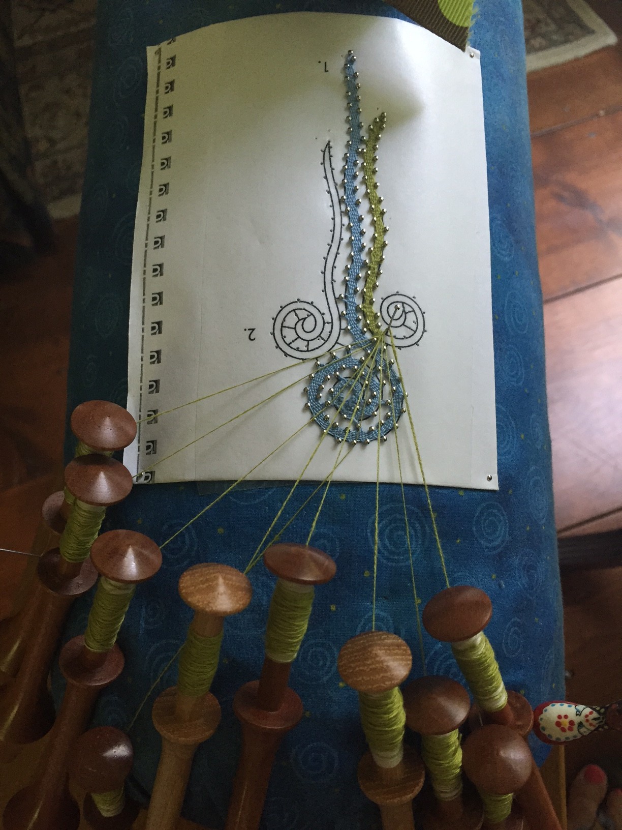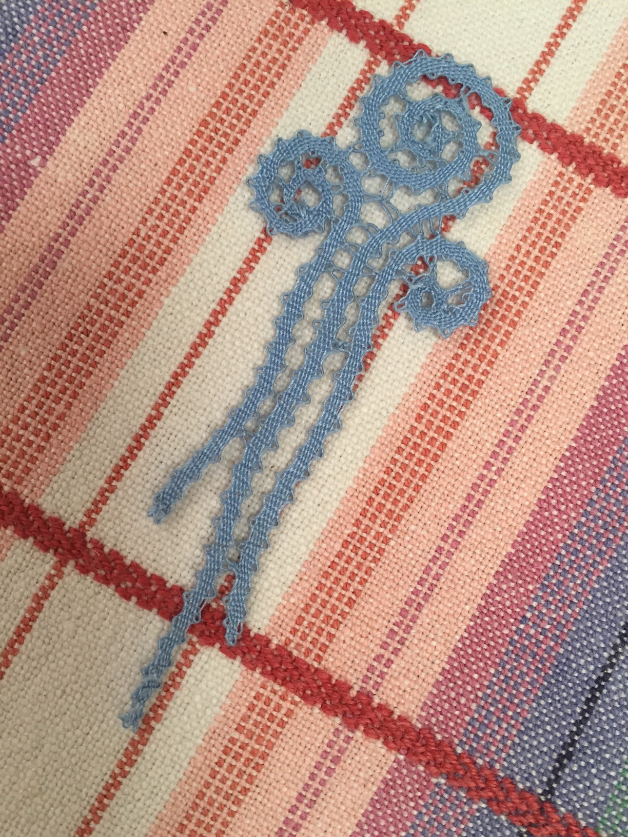 And I turned my attention back to the little Idrija lace ‘doodah’ that I started at the lace retreat back in May. This little organic shape reminds me of a fiddle head fern or some kind of sea creature. I’ve decided to make this two more times in a combination of blue and green.