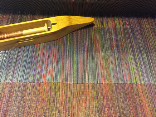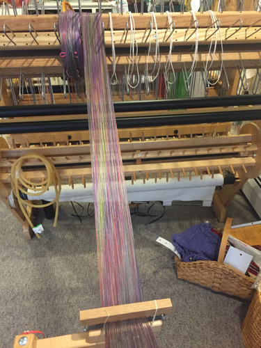 Some weavers have asked for more info on this project, so here it is. The warp and weft are two entirely different colorways of Just Our Yarn “Almaza,” which is an 8/2 tencel thread. One colorway is a bit on the cool side, with blues and purples, jazzed up with a bit of acid green and soft roses. This is my warp.