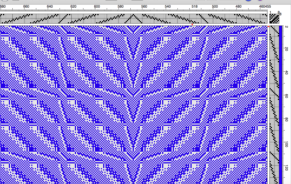 I put the basic weave structure into my PCW program which I wrote about here. Then I had to make the BIG decisions. The pattern moves across the warp in one direction only. Did I want that or did I want a mirrored repeat at the halfway point across the warp? Did I want to mirror every pattern repeat? After sampling these ideas in PCW, I decided to leave the structure in its simplest form. Mirroring every repeat made a very busy fabric that looked like a headache waiting to happen!