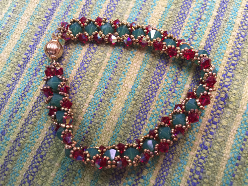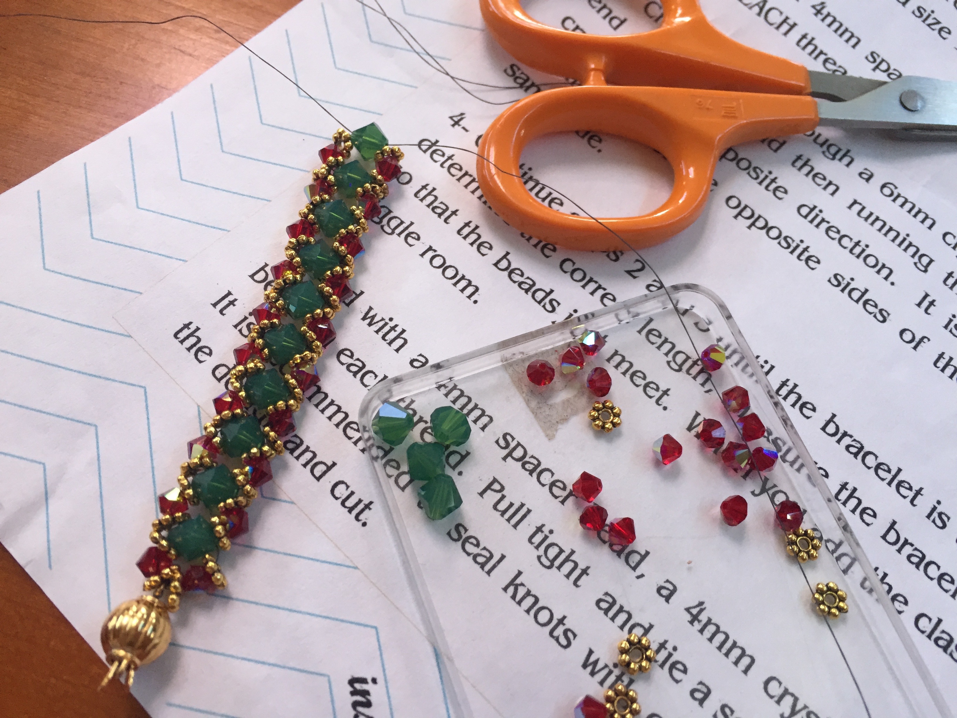 Before I left in January, I’d been through rather a roller coaster of family events. A friend of mine sent me a package of goodies with cards, and the note that was attached read: “It’s a testament to the cycle of life that in one package I am sending you congratulations on the birth of your granddaughter, sympathy for the loss of your mother, and a birthday greeting as well.” How true….it was a crazy month in which all that happened. In the package was a kit for a beaded bracelet that I had admired my friend wearing back during the holidays. With red and green crystals, it was very festive for Christmas, and so sparkly! A couple of days ago, I sat down to make the bracelet, which thank heaven was easy enough for a non-beader like me. It took me longer to search for the beading needles I could swear I brought with me, give up on that, and then search for the finest embroidery needles I had onboard, than it did to make that bracelet. Voila!