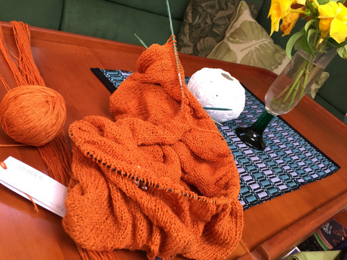 During this time Bob is also washing the cockpit with fresh water and a brush–think swabbing decks from the old days! I’m down below, out of the sun. I’ve finished writing some emails and am turning my attention to an orange linen sweater that I set aside some months ago.