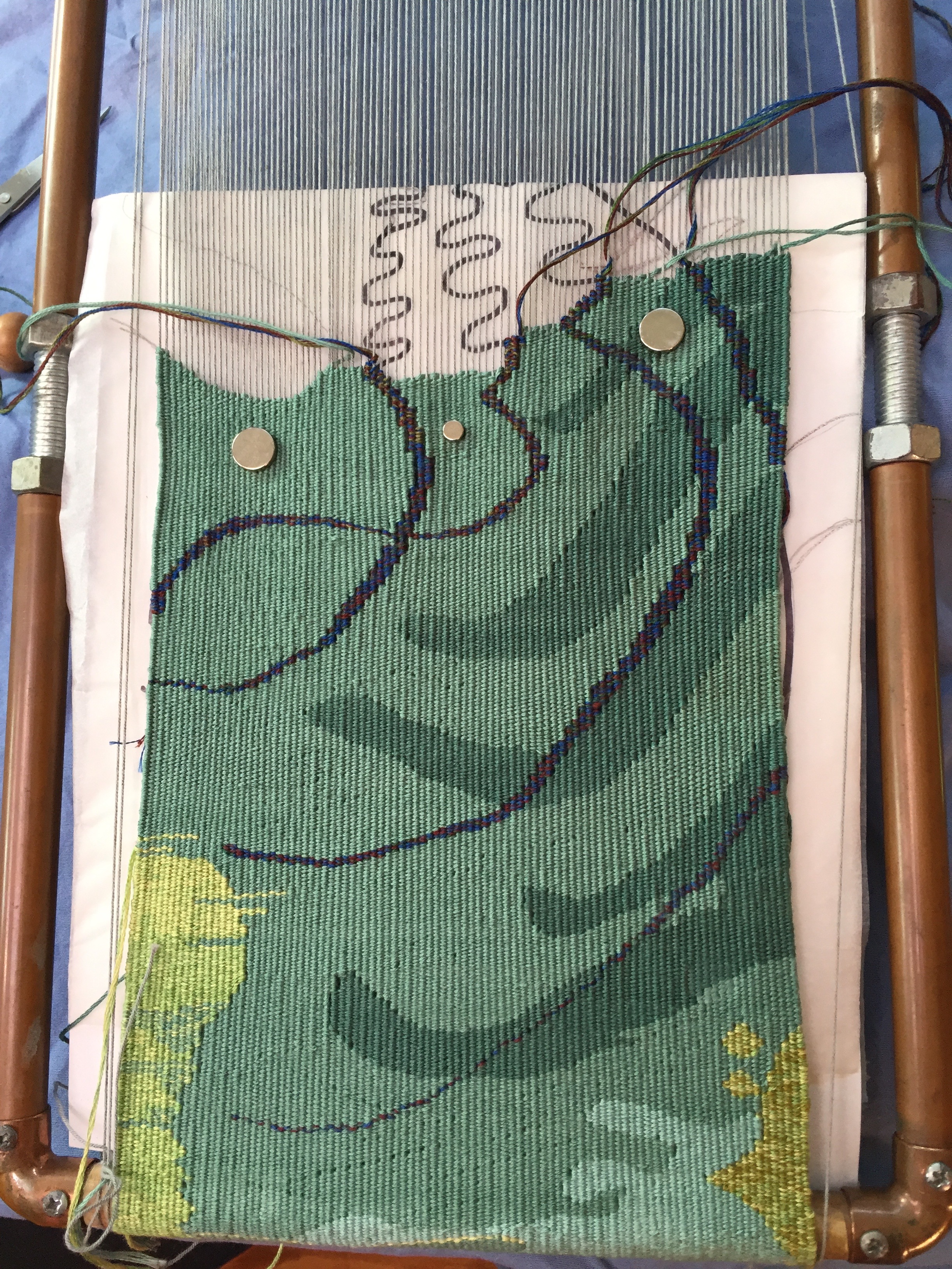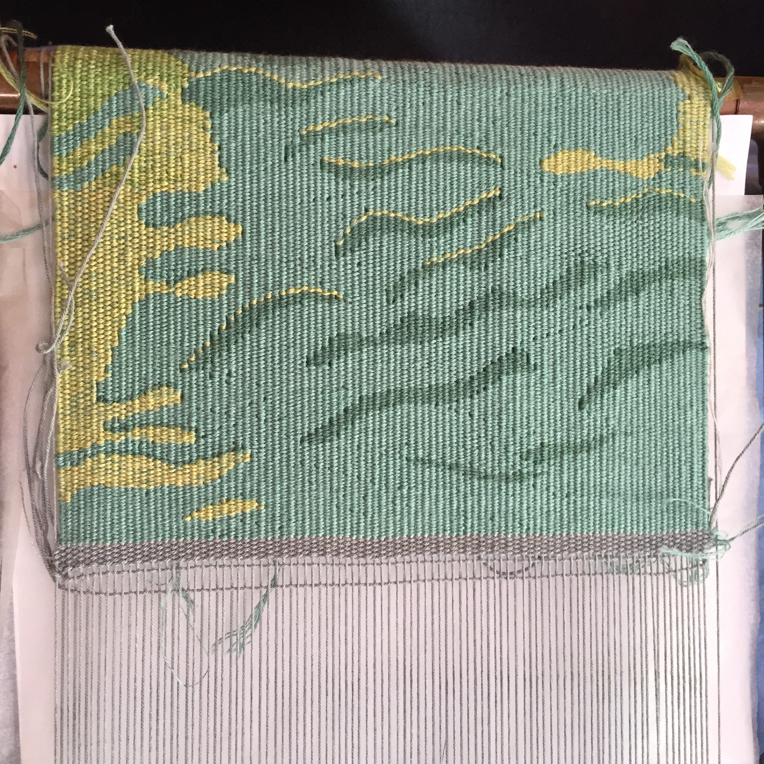 I warped a small loom which means as I weave I need to advance the warp and pull some of it around to the back. Not being able to see the entire piece at once is giving me lots of qualms. If I don’t like it in the end, at least it has given me plenty of hours of creative problem solving and enjoyment weaving.