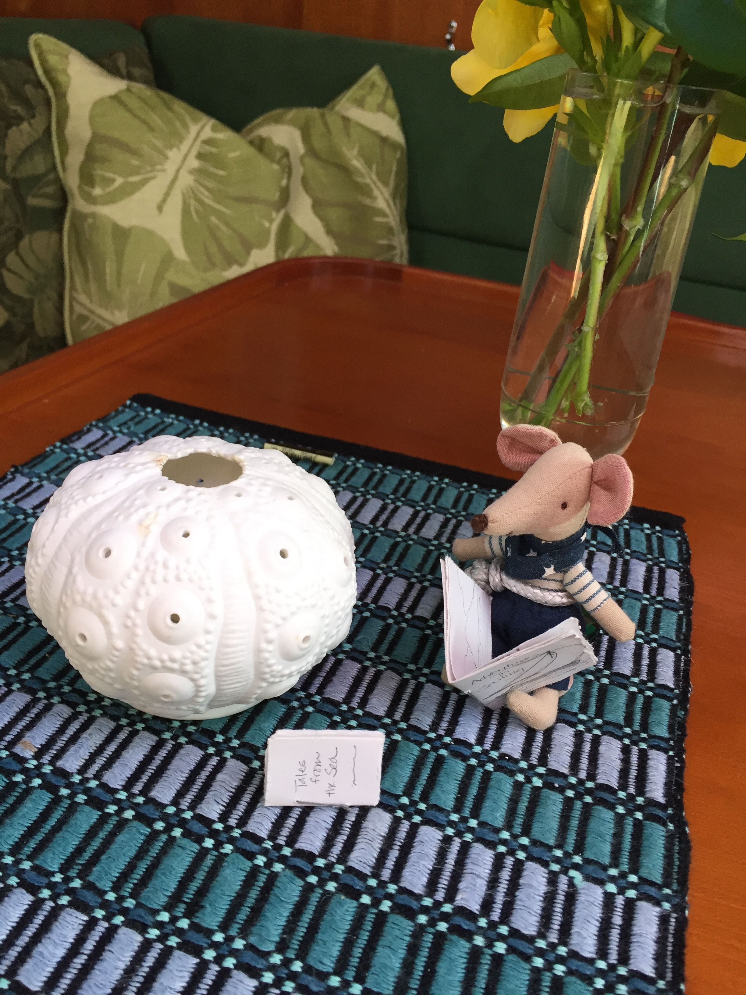 Quiet time onboard seems very different than at home. There are simply less distractions, at least for me. Bob is very busy whacking moles these days, so I’m not sure he has much quiet time. During mine I have had some very productive creative thoughts about what direction I might take on a number of projects that I have left at home as well as on projects that I have in mind for the future. I have made some notes for my large Portuguese Man of War tapestry and am looking forward to starting that! It will make use of different techniques and skills that I have picked up over the years, and some of these have nothing to do with tapestry. I hope this project will be a successful blend of techniques that I’ve used over many years. It’s time to bring such things together in one statement. Or so I hope.