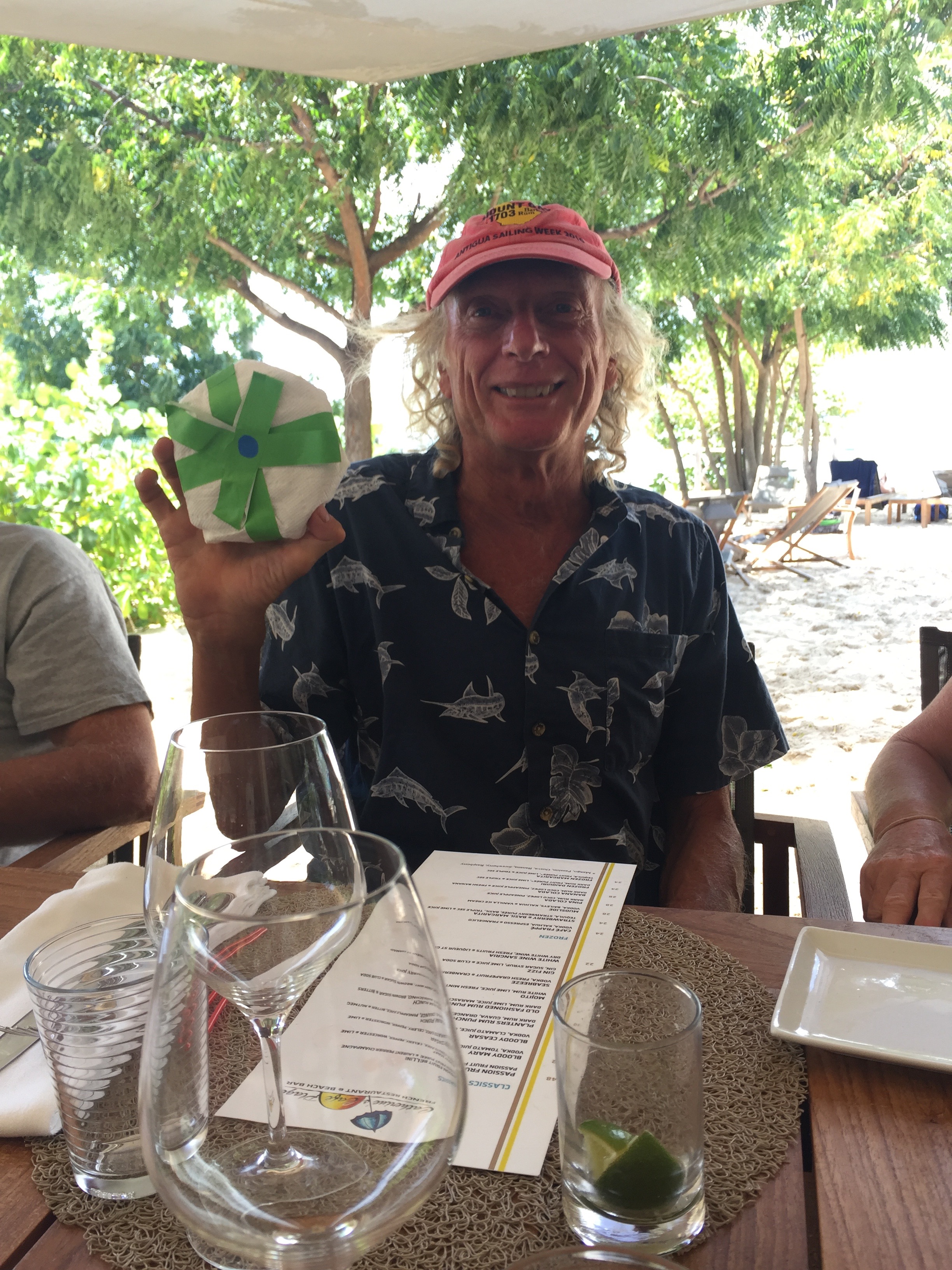 Here’s Bill opening a present just after we sat to down to lunch at Catherine’s. What a spot! — an elegant dining room, open right onto the beach in Falmouth Harbor. The chef is French, and so far it was the best meal I’ve had this winter. So, I know you are dying to what I had for that best lunch of the winter — Tuna tartare with a wonderful mango sauce to start, and then a lobster salad that was so tender I almost didn’t believe it was Caribbean lobster. Yum! That empty glass in front of Bill was a Rum Ti, something I’d never heard of before. It is white rum with cane syrup and lime juice. He loves them!