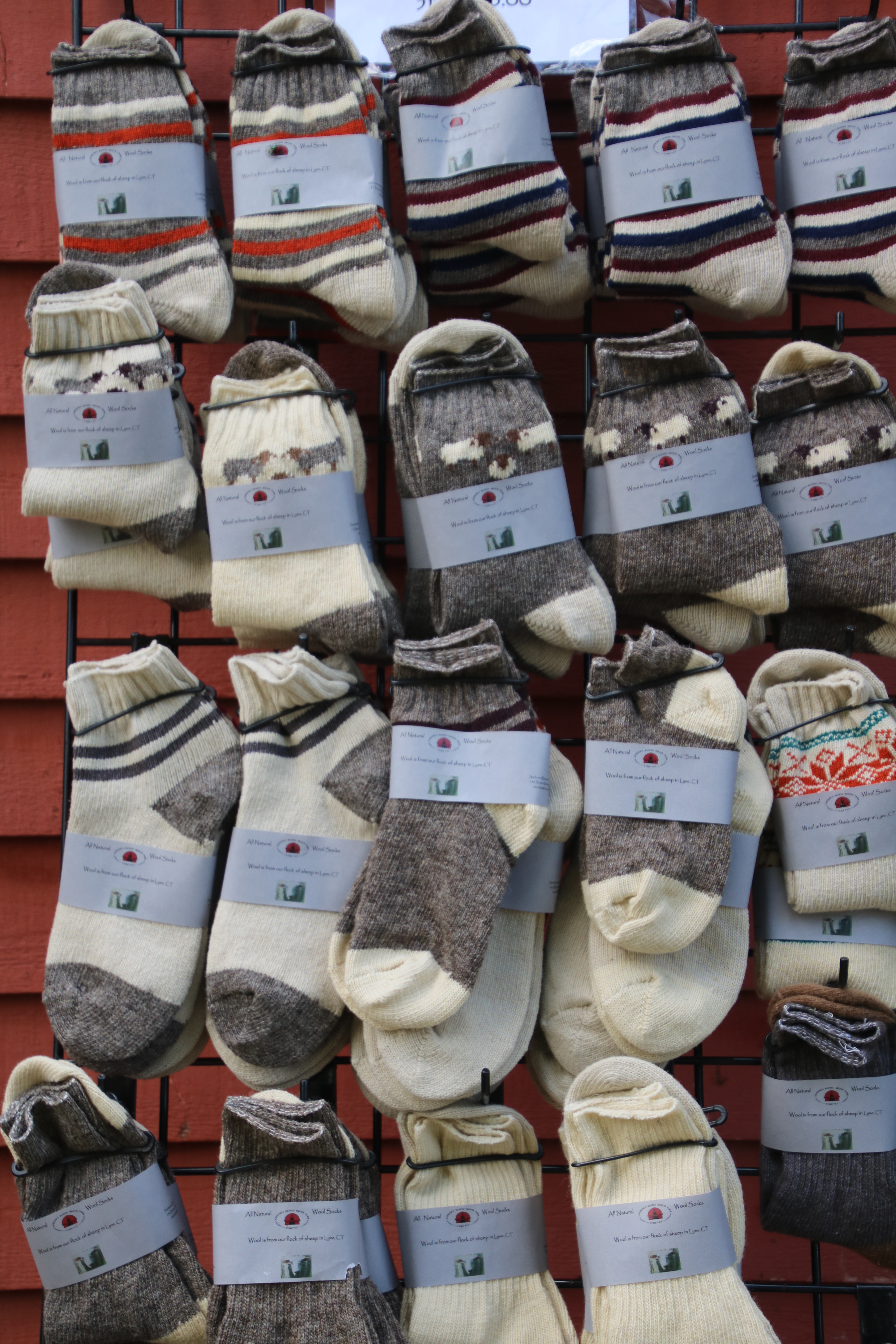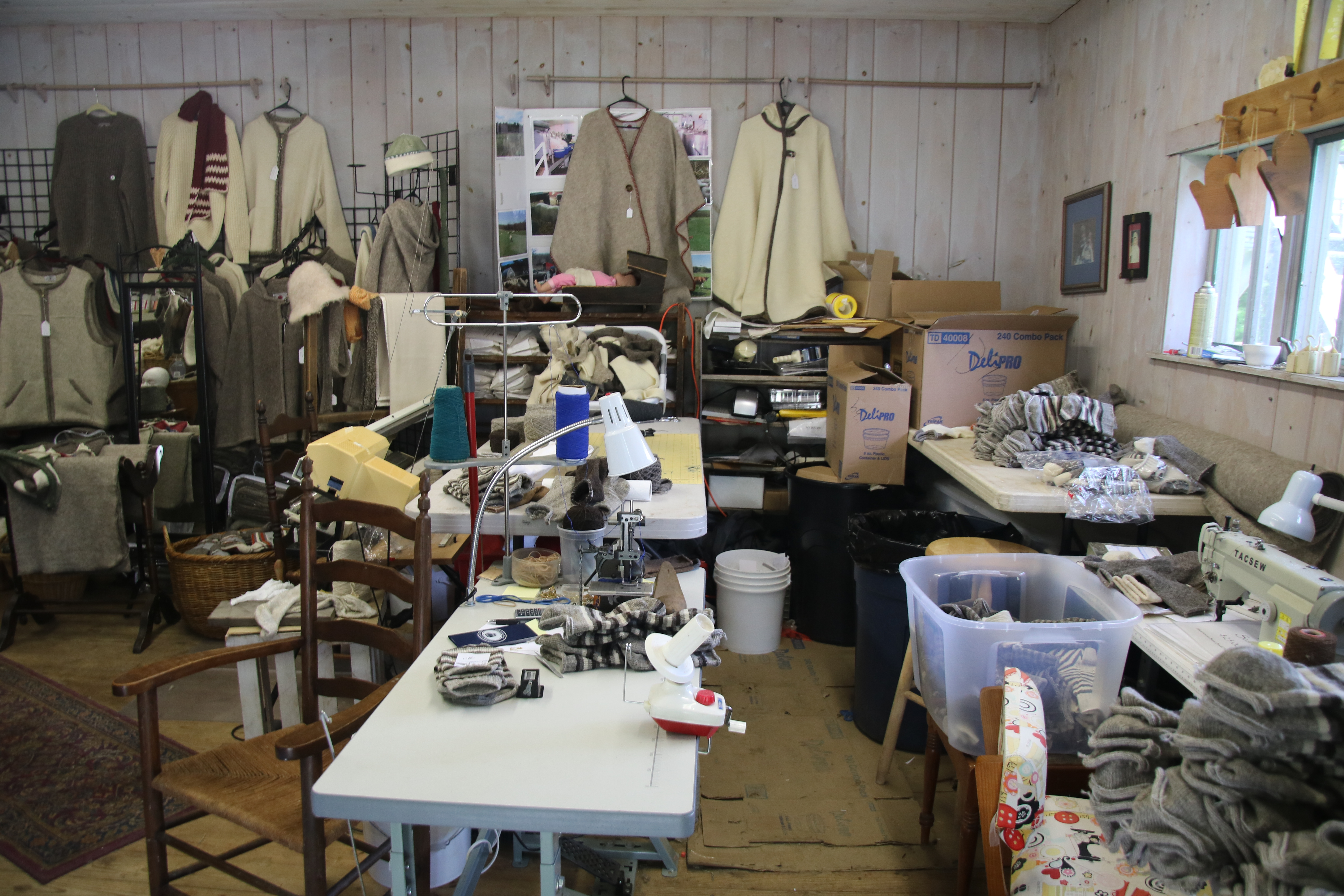 Inside the shop is more of an idea in progress than a fully functioning shop. They are just now branching out with the idea of making and selling things from the wool of their sheep. (Did I ask what breed these sheep are?? How could I neglect to do that?) The raw fleeces are sent to a mill in Massachusetts to be washed, then sent south for spinning at a mill in in either North or South Carolina. Some of the yarn is used to weave fabric that becomes blankets or clothing items, like capes and vests and sweaters. But look at all those piles of socks!