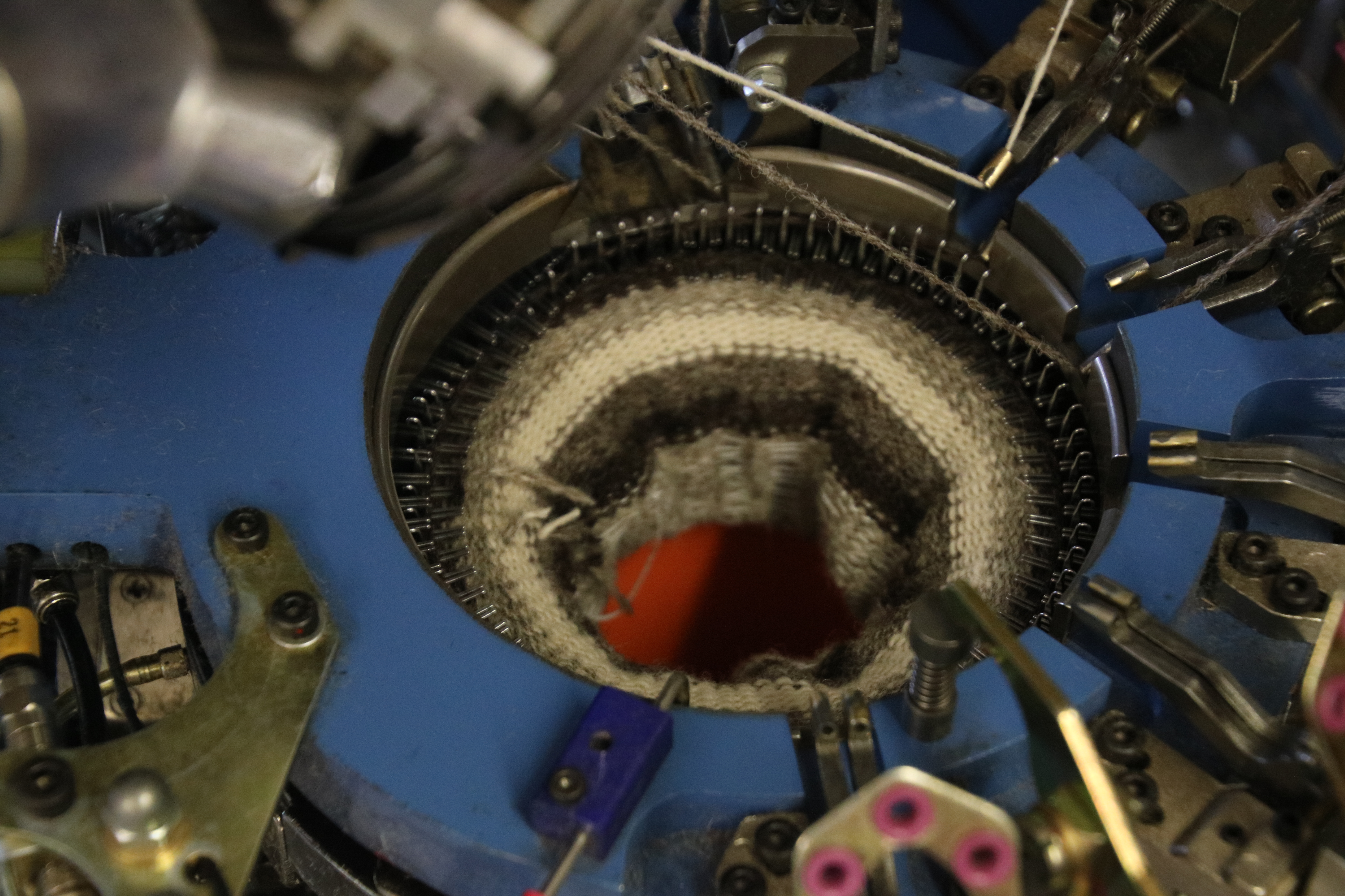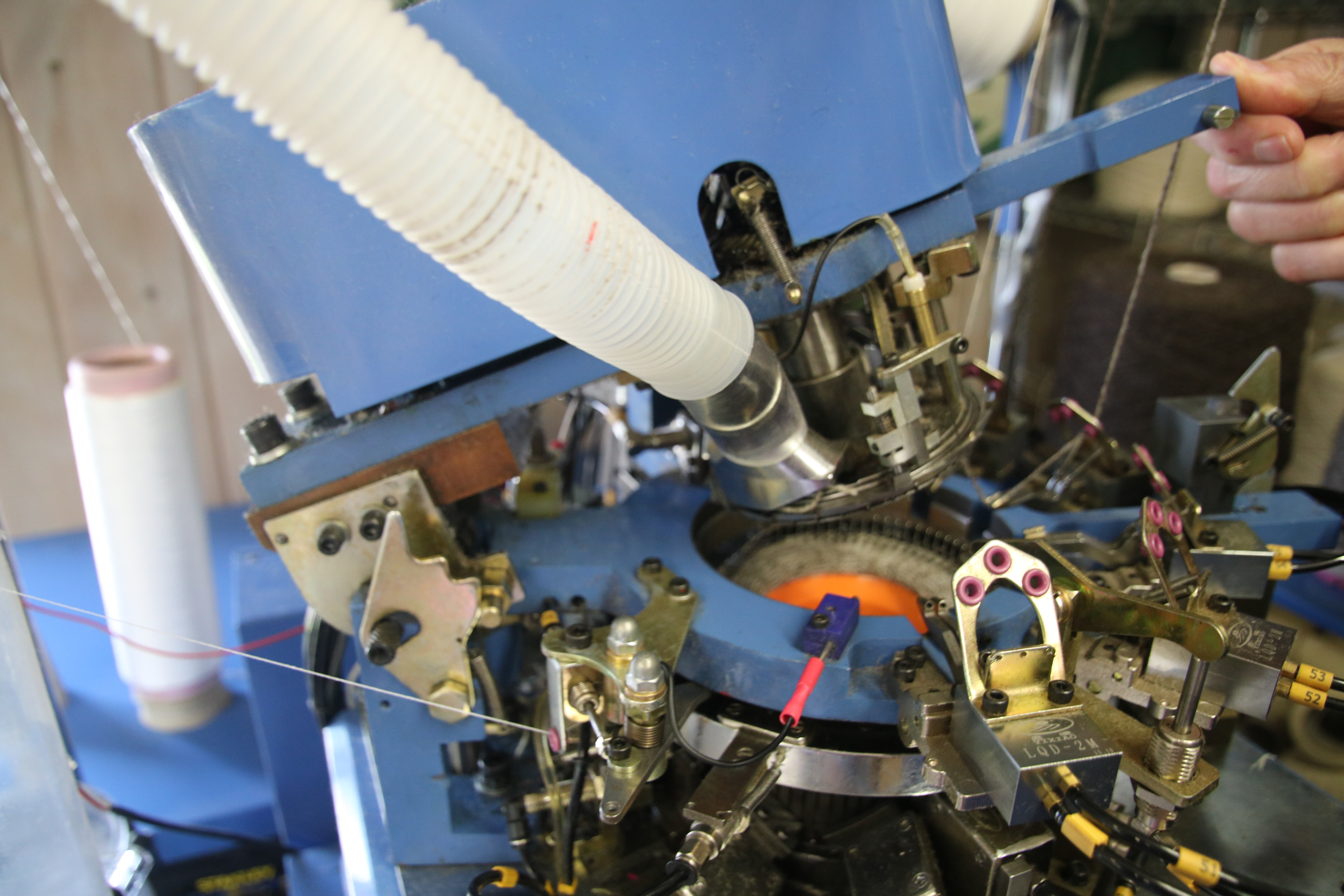 A sock in progress down in the center. That plastic tube is where the sock will get shot out of the machine and into the bucket.