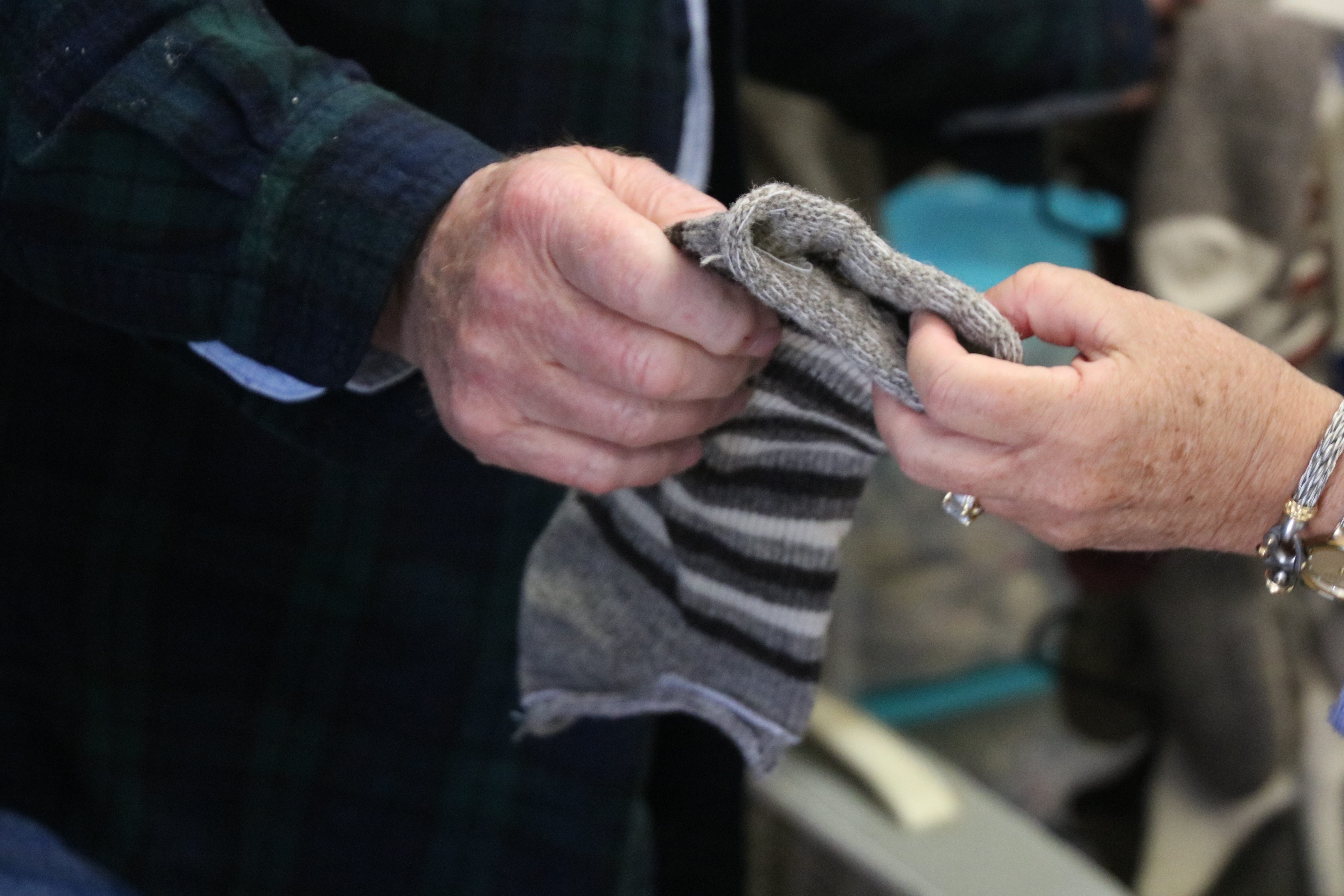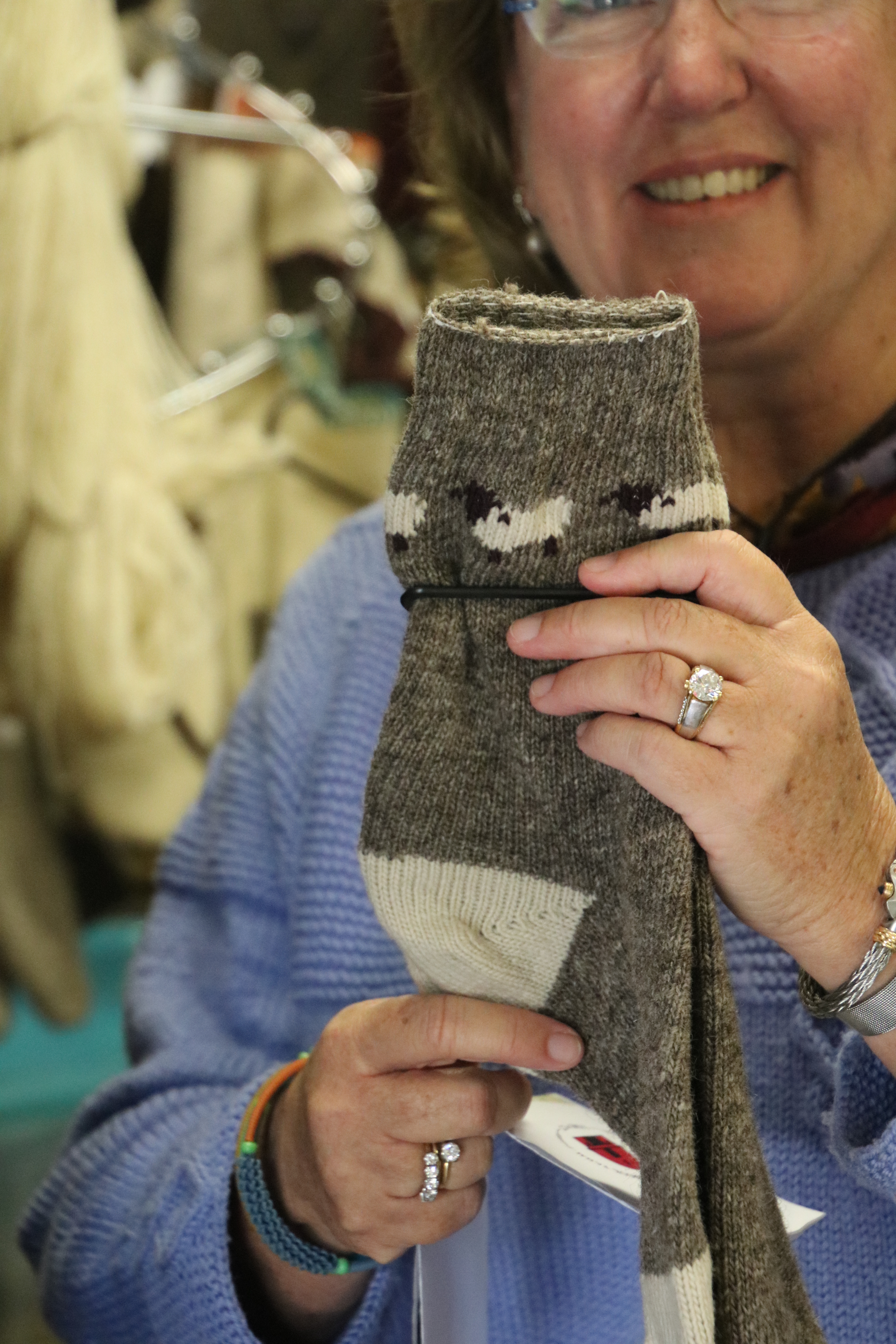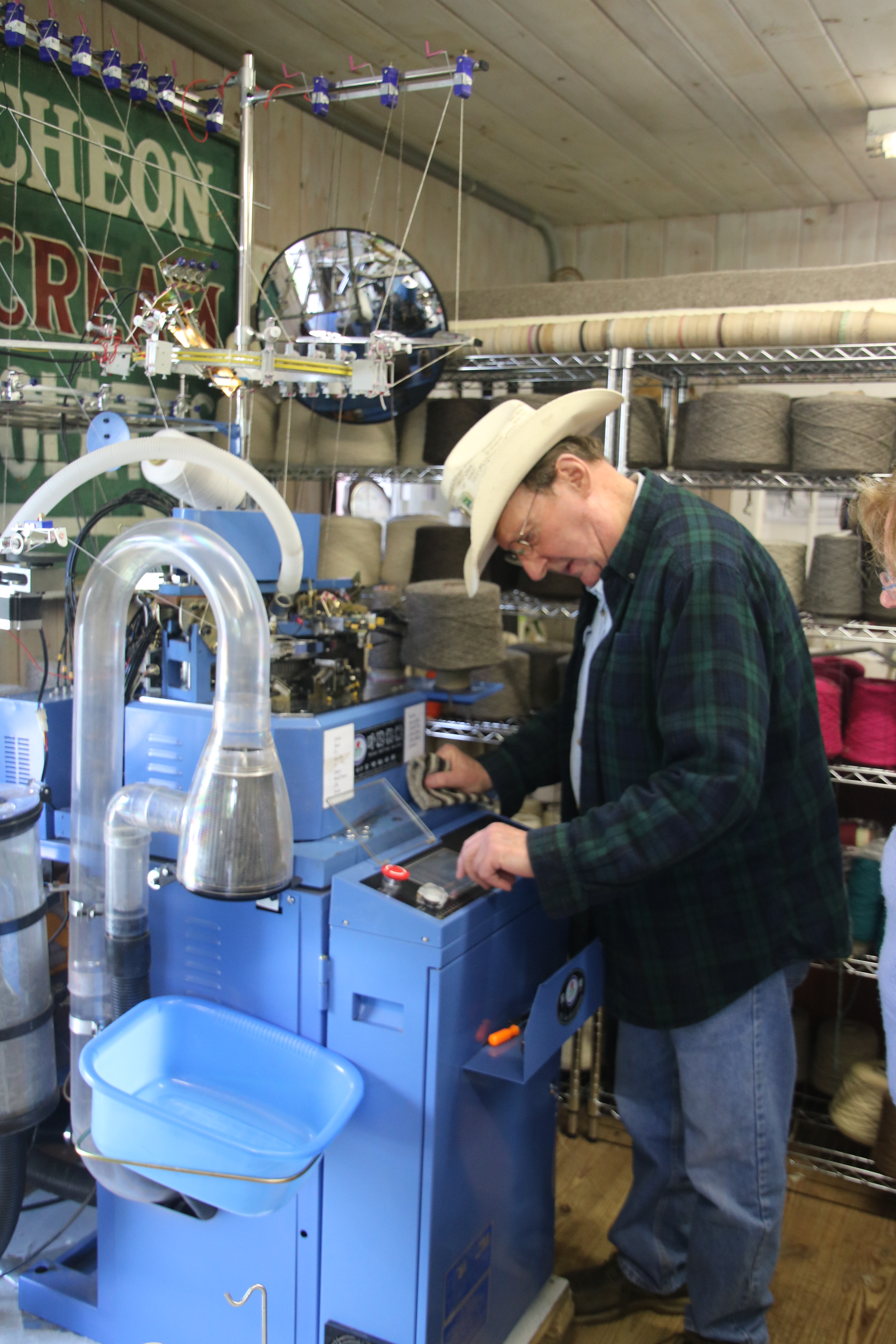 It takes only 3 minutes for this machine to knit a sock. There are lots of choices of sizes and designs for the socks. When the sock is finished it shoots out into the blue plastic bucket in the foreground. I burst out laughing when the sock came shooting out!–sans toe because Stan has the toes done elsewhere and also has the socks washed elsewhere which makes them much softer than what we are holding here.