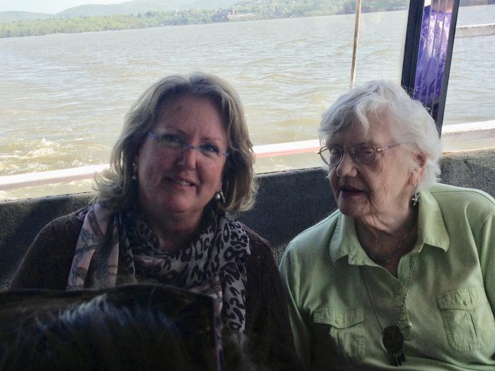 And forgive — I can’t resist! — here is a photo of June and I together at another celebration of her 85th birthday. Our small group of weavers from the Hudson Valley area took June on a boat tour of the Hudson, from Kingston, down past West Point and Bannerman’s Island.