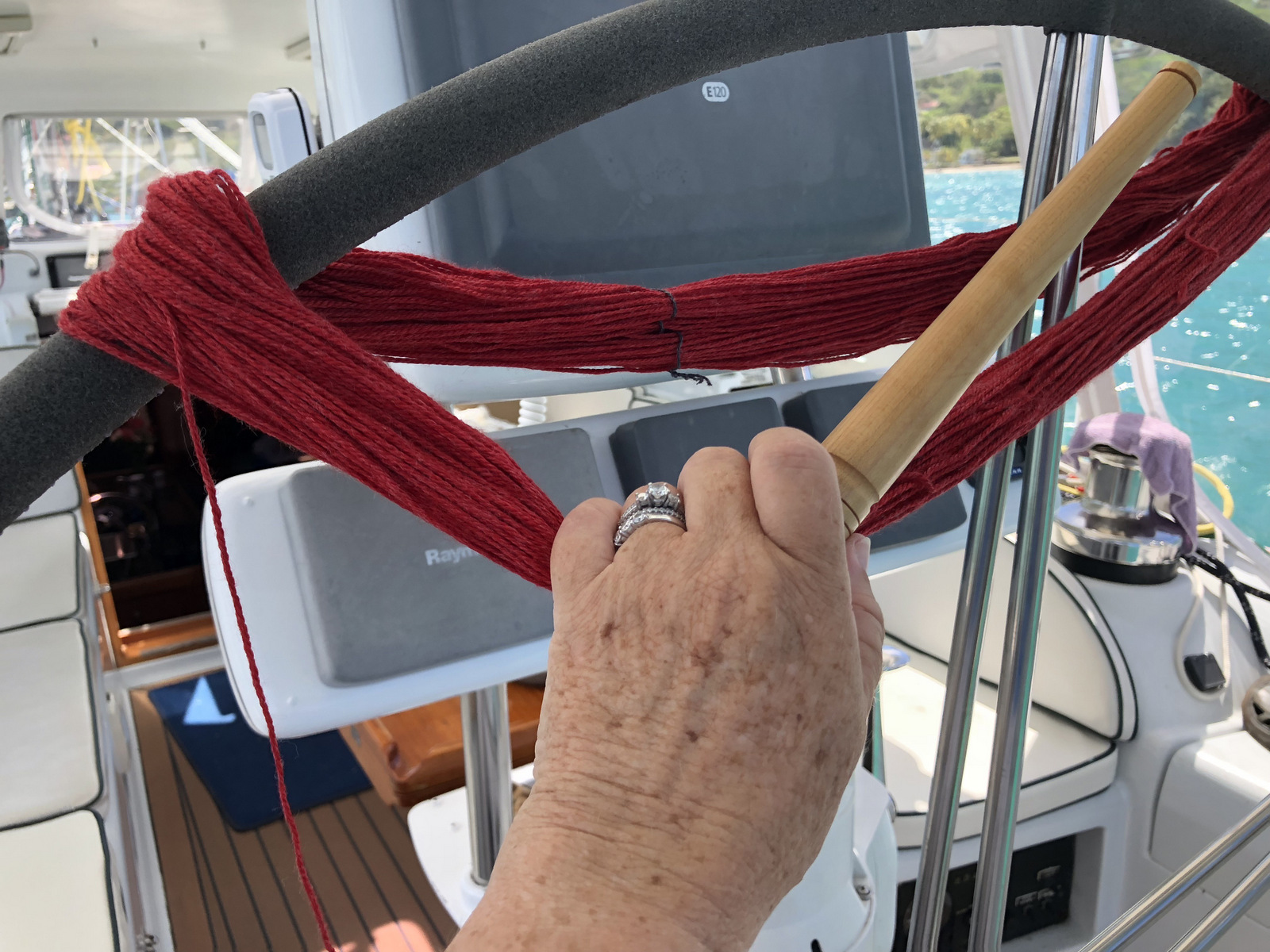 To wind balls, I stand behind the wheel on the helmsman pedestal. In a roll-y harbor, such as here in Bequia, I need one hand to hold on to something to keep from falling, but I also need two hands to wind that ball. So it’s a messy job, and I was a tad seasick by the time I finished. Then, I decided to save this project for the future anyway. Oh well.