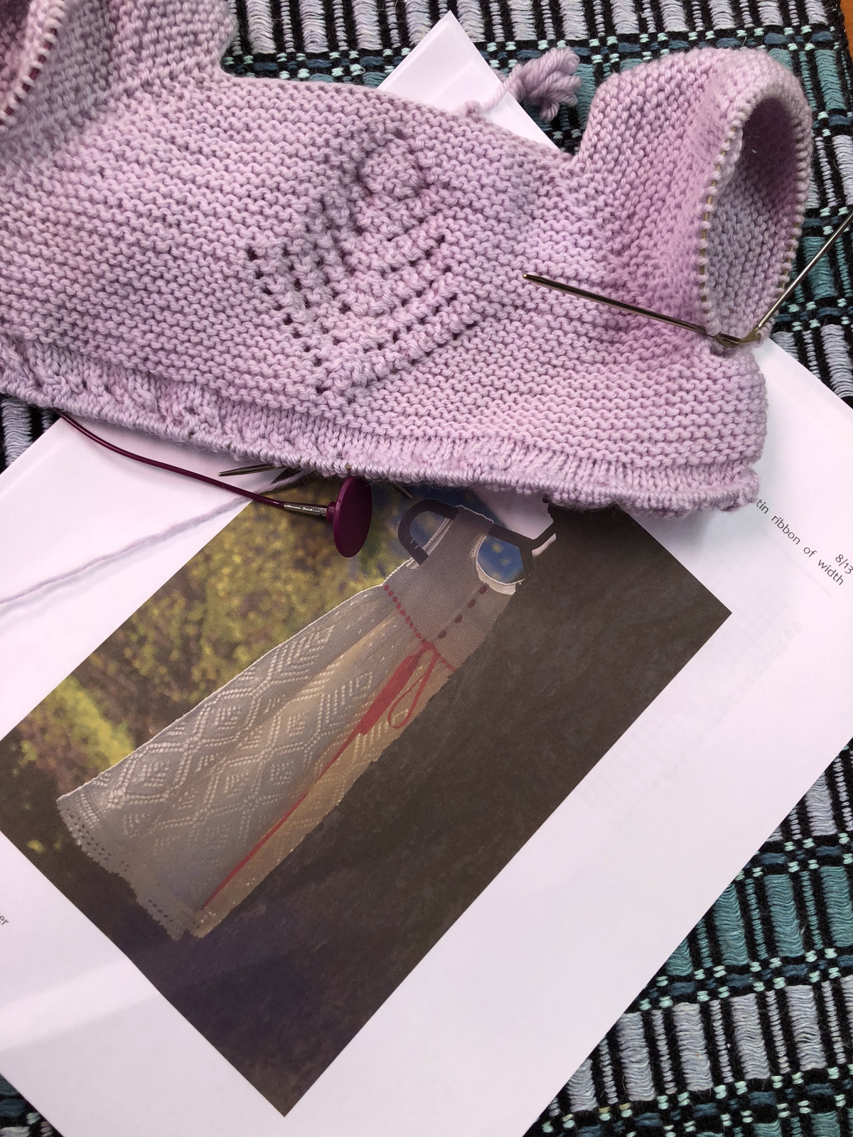 I can’t help thinking that in finer white merino, this pattern would be a wonderful christening dress. Can you tell where I’m going with this.? A knitted christening dress would sure progress faster than bobbin lace and sewing! I think I might be just a tad obsessed with knitting for grandchildren….Just saying….