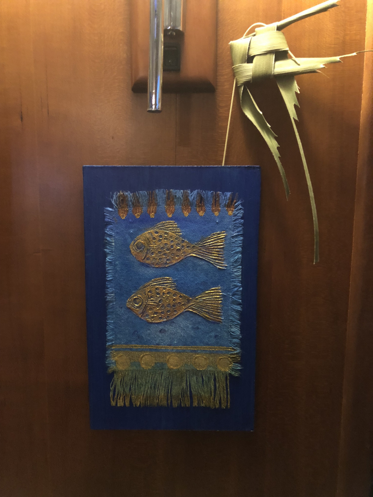 I particularly enjoyed a visit to Oasis Art Gallery, where I bought a small painting done on canvas that has fringed edges and is painted with a thickened mixture of, well…something! L. D. Lucy said she feels she is making tiny tapestries with this technique, and that is exactly what attracted me to these works! Here is the one I chose. I put the little woven fish on a stick with it, made by Tom the basket maker in Marigot.