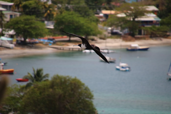 Bob and I walked up to the 18th c. English garrison for the best view of the regatta during Saturday’s races. We were so high that the frigate birds were flying below us! We are always trying to get a photo of a frigate bird in flight, and you may notice that I’ve never posted one before. Bob got this shot, after both of us have spent six years trying! The photo does not do justice to showing how large these birds are. They have the biggest wingspan of any bird, and they can glide for hours. Since they fly far offshore, but cannot actually land on water, they can sleep while flying.