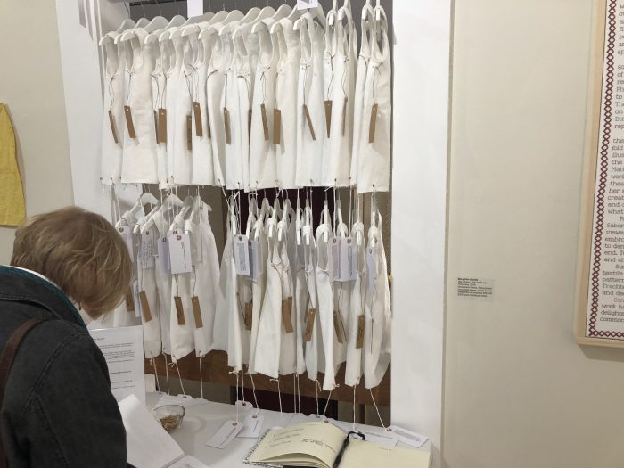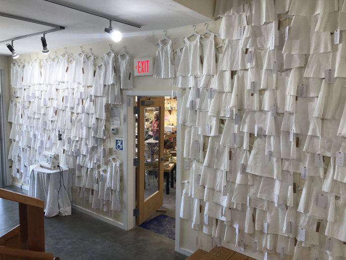 I’m so disappointed that now I do not have her name, even after checking on the art center’s website and doing a Google search. Each dress had two tags attached it. One was an official tag that had the administrative number of the adopted child, and then there was also a plain 3×5 note card on each slip that had a handwritten memory about a child’s birth family. Many children were adopted at such a young age they have no memory of their family life before coming to the US. And that was the point of the exhibition–that our memories of family are so important to who we are, and yet many children don’t have that. It was a moving installation, done by…. I seem to have lost the information about the woman who made this installation. I took her card, but that was now two weeks ago!