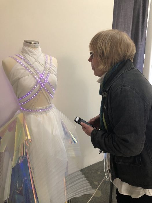 Valerie Ann Phoenix’s work in this exhibit was a dress made of interesting materials that I cannot name. Some of it seems to be thick mylar. There are strings of lights wrapped around the dress that respond to noise. The louder the noise, the brighter the lights. Well, who can resist that? Both Jody and I spent time making soft and loud noises, and I tried singing some high notes. It was a fascinating piece, and it required that I venture out of my comfort zone in order to interact with it!