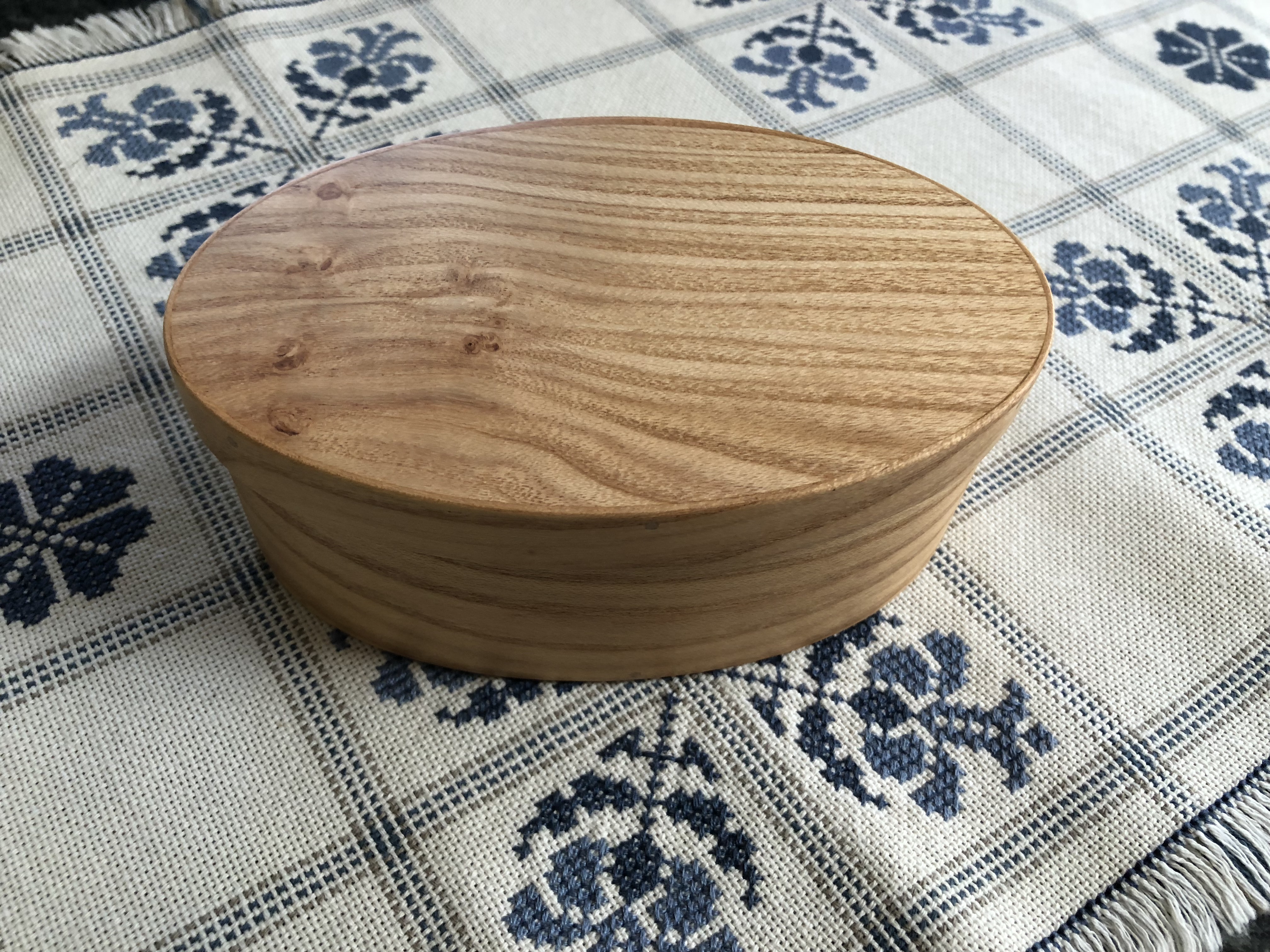 One of the owners of Aisling Yarns makes Shaker boxes out of fallen trees that would otherwise get burned as logs in his fireplace. He had a selection of sycamore boxes that were my first choice, but since those were already sold out I easily made peace with this honey locust box. It has beautiful patterning on it. It’s a small box, which this photo does not really show. It now holds small embroidery scissors along with my small bobbin lace tools.