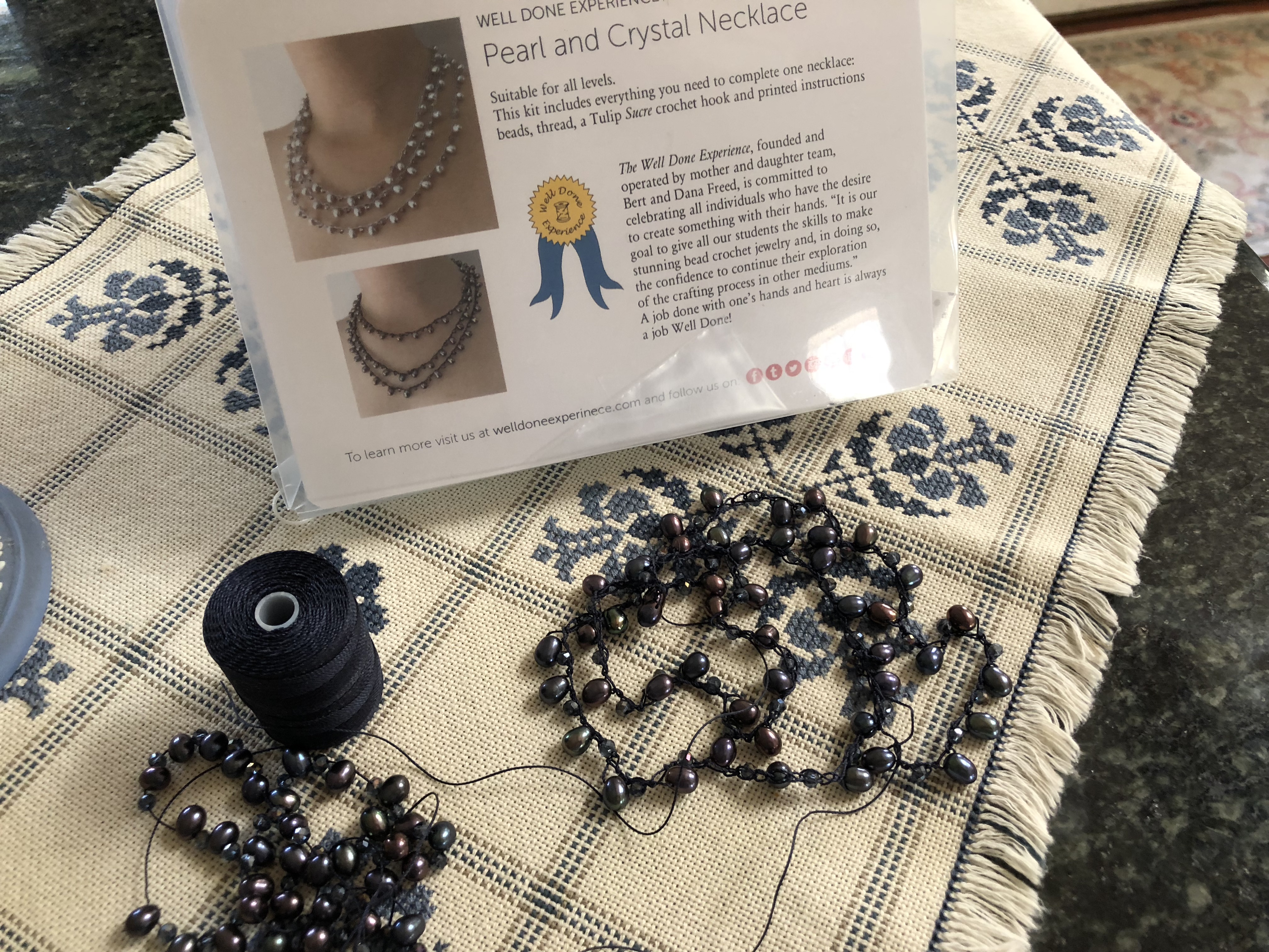 I also succumbed to some things that don’t fall into the fiber category. I came right home and crocheted this necklace of fresh water pearls and Swarovski crystals. It was almost instant gratification.