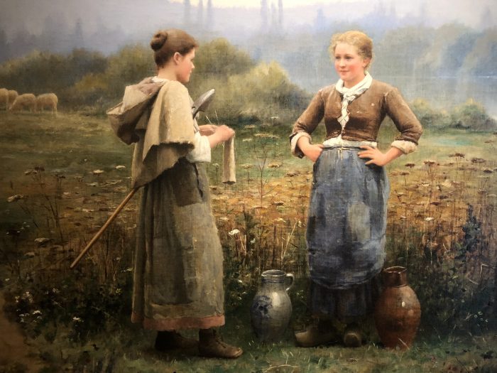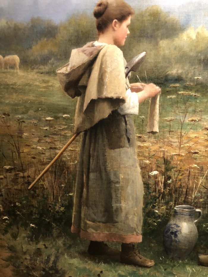 This is the prize winner. I had to go back twice and look again. It is a stunning landscape with the fog and the sheep in the background, and the spent flowers in the foreground. But these two girls are show stoppers! I can feel the chill in the air, the blush on their cheeks from hard work, the roughness of their clothing. And look! One girl is knitting! Daniel Ridgway Knight, The Meeting. 1888.