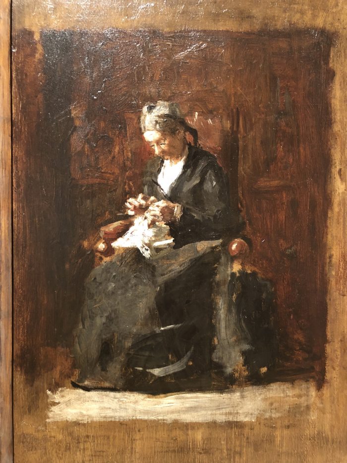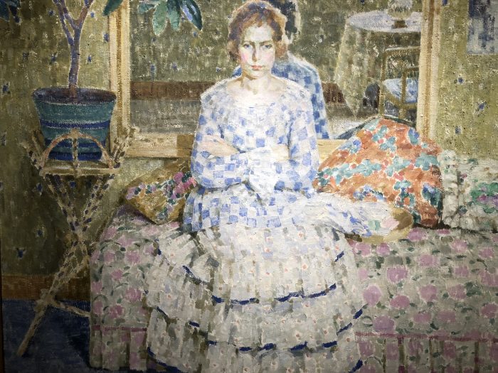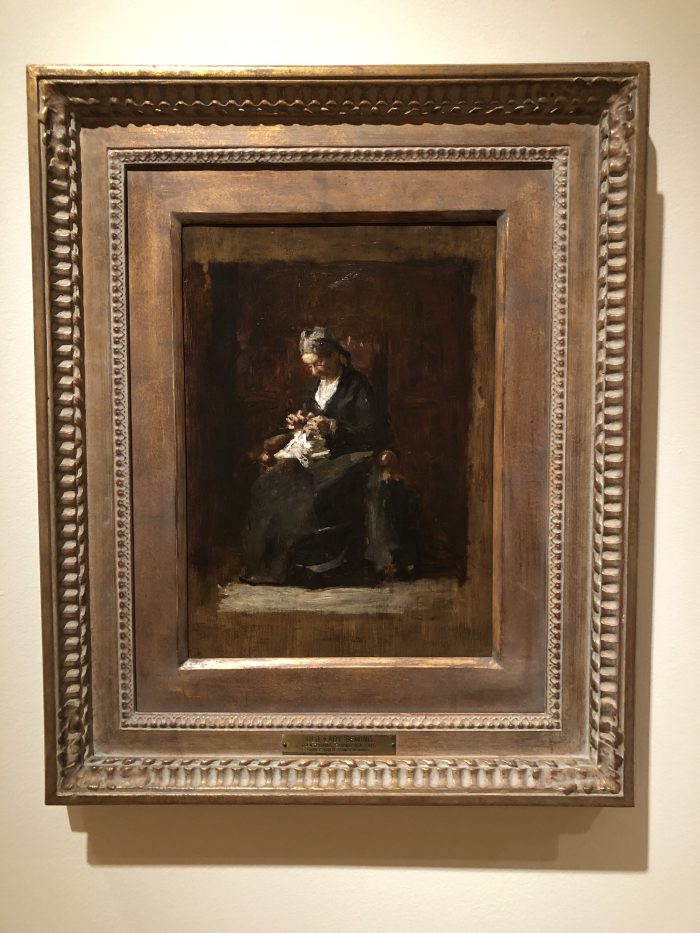 Whenever I visit a gallery of paintings, the works that depict textiles grab most of my attention. Bob and I visited the New Britain Museum of American Art last week. It was our anniversary, and I could picture us wandering the galleries together and talking about what we liked. In reality, we were hardly in a room together. He lingered over the landscapes, while I was drawn to portraits and landscapes studded with people captured in the daily work of living.