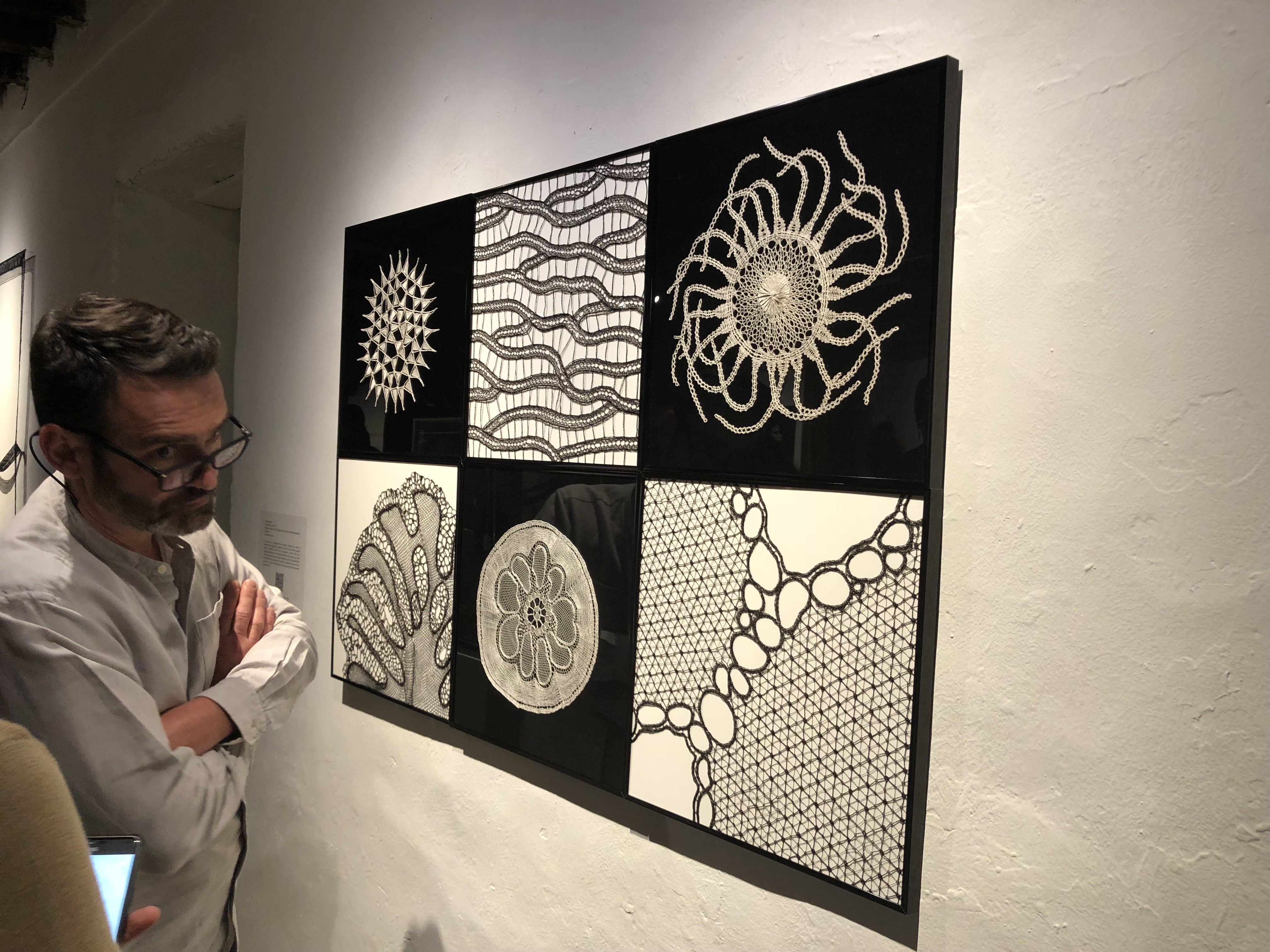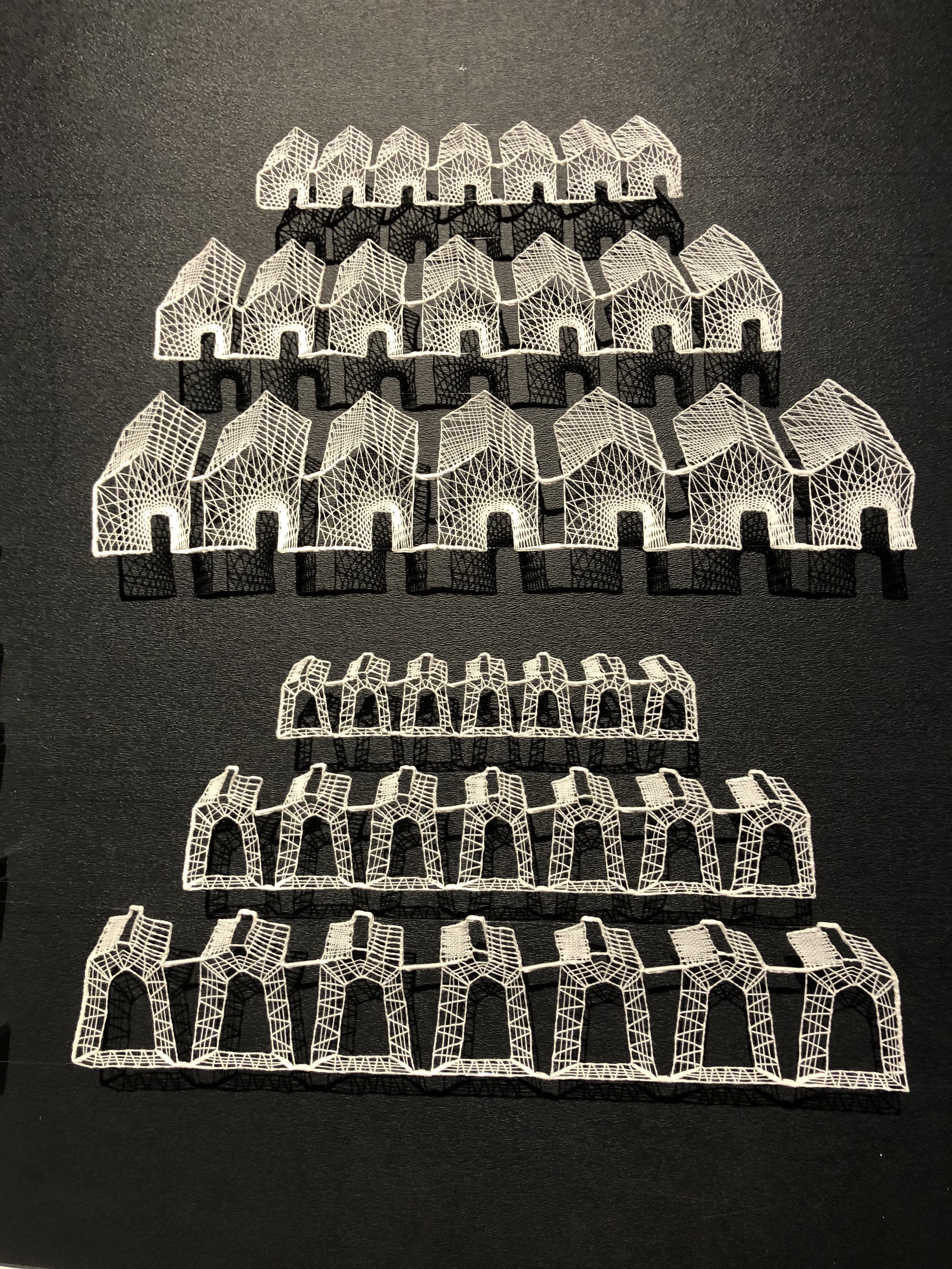 And here is the piece shown on all the promotion materials for this exhibit: Lieve Jerger ‘s “Carriage of Lost Love, 1977-2018.” It was housed in its own room, where the shadows cast on the walls and ceiling by this bobbin lace construction of copper wire was lit from within. A staff member of the museum stood at the entrance to limit the number of people entering at one time. It allowed all of us to see this work and enjoy the shadows cast all around us.