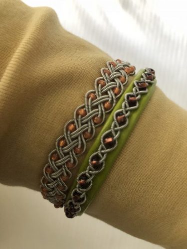 Here are my two bracelets. Who knew that reindeer leather could be dyed? I could not resist the bright green!