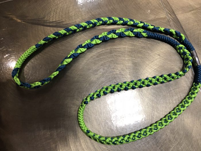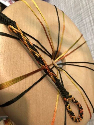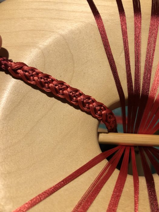 In the previous day’s class, taught by Rosalie Neilson, we learned to do core braiding with the aid of a core stand. Here is the braid I made in that class. I learned something brilliant in that class about how to save a braid to continue in future. Take off the tama and replace with ‘easy-bobs,’ then put each element on a foam braiding disc in the order they were in on the marudai. Later, you can put the whole thing back on the marudai.