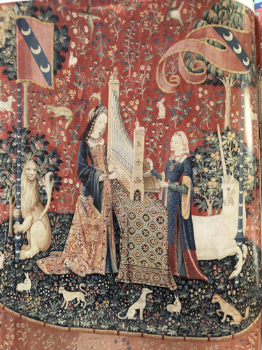 The tapestry class I’m teaching started earlier this week, and since we are studying traditional Gobelins style techniques, I can’t get the “Lady and the Unicorn” off my mind. I started reading the book I bought at the museum, which also brings up bits of info that are filed deeply in my brain from my college years–a long, long time ago at this point. I enjoyed studying the MIddle Ages in college, in between the classes I needed for my majors.