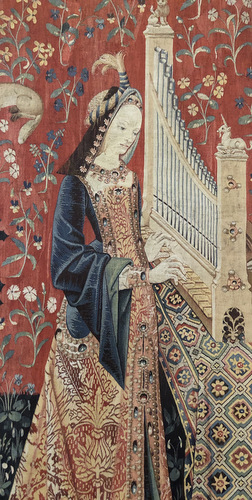 I was intrigued to learn that the tapestries were repaired in the late 19th c., after being acquired by the Cluny Museum, and that the woven areas near the bottom of certain pieces have faded dramatically from the rich red to a greyish pink. The upper areas that are still original have surely faded some, but are still a deep madder red. What was used on the repaired areas? Could it have been the recently developed aniline dyes? Can I get an answer on this? Do you see the badly faded area at the bottom of “Hearing?”