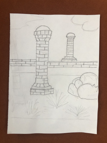 Here’s the sketch I made back in early January. The Pillars are a significant landmark in English Harbor. They were part of a sail loft during Lord Nelson’s command of Antigua. The two rows of pillars, about a dozen in total, supported a wooden sail loft that has not survived the centuries. While in English Harbour, a ship’s sails could be lowered into a smaller boat, such as a gig. The gig would be rowed into the channel between the two rows of pillars, and a derrick would lift the sails up into the sail loft through a large hole in the floor.