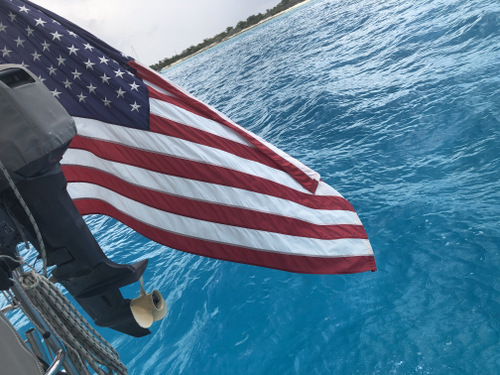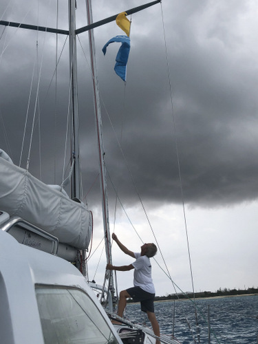 I’ll close with this photo of Sailor Bob, ever ready to take on a long journey and make the best of whatever conditions Mother Nature throws at him. He’s hoisting the “Q” flag (for quarantine) and the giant Salty Dawg rally banner. Do you see that threatening black cloud above us? That’s another squall in the making. Bob is not worried about it. He set the anchor well and now intends to open a cold beer and get some well deserved R&R. As he sat down to enjoy himself, he got a wonderful air show of a US Coast Guard helicopter landing on the airstrip in Matthew Town. I was so tempted to hail them on the radio and ask for a ride home!