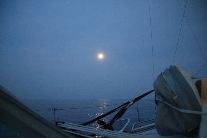 We are traveling during the time of a full moon, which does make for a a few moments of excitement in that otherwise endless view of water and more water. The nights have been overcast due to the squally weather, but the moon has been a lovely gem.
