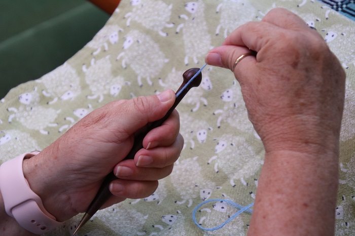 Some people have hand and wrist injuries that may make this procedure uncomfortable. If so, you can use your non-dominant hand to wind the yarn on the bobbin in a ‘round and round’ motion. This does put some added twist into the weft yarn, but saves any discomfort.