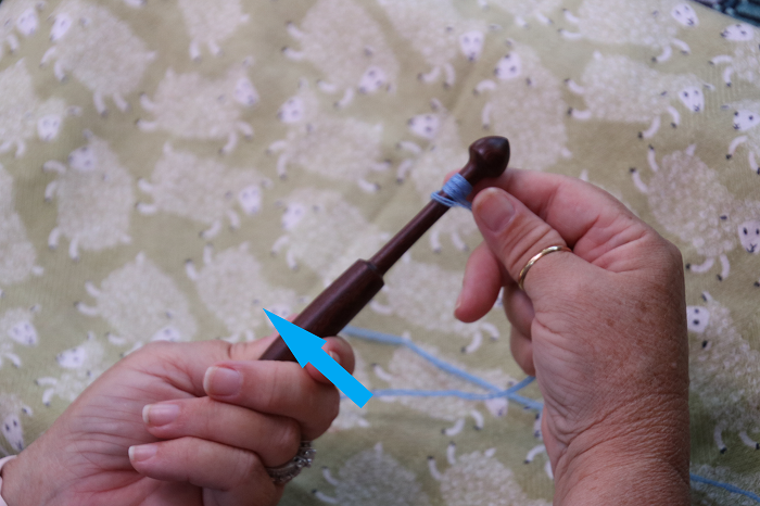 Although the photos show winding a bobbin for a left-hander, the description is written for either handedness. With the bobbin in your dominant hand, you want to turn that hand in an outward motion so that you do not cause any wrist strain. Start with the bitter end of the yarn parallel to the bobbin’s neck, with the rest of yarn facing upwards over the top of the bobbin.