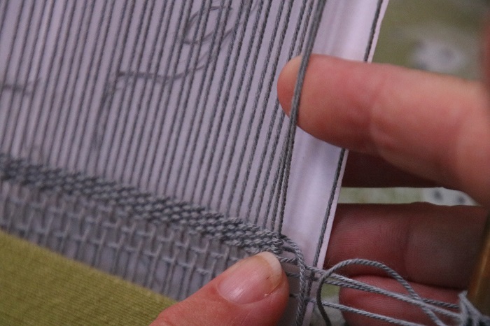 –Let’s look at the selvedges. On the right where my weaving started, the selvedge thread is a high because when I turn the weft around it that thread is covered by weft. At the other side of this warp, you will see that when I turn the weft around that last thread it is not covered in the new pick. It is a ‘low.’ Take note of how this makes the two selvedges look quite different from each other.