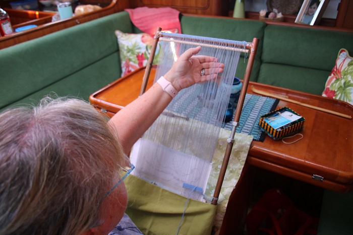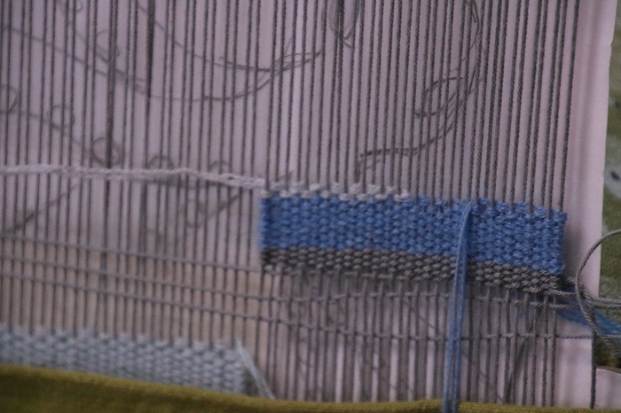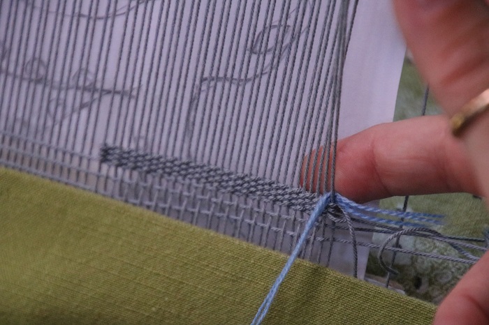 I’ve written this short tutorial for a friend who would like to start weaving, although we are far apart at the moment and not able to visit during these strange times of the Covid-19 pandemic. At the moment I am living on a boat, far from home, so I do not have access to the loom or the materials that I’d use to do this. Since I do not have access to my studio, I am using a loom that already has a project in progress on it. I’ve covered the work in progress so it will be less distracting, but there is a bit of my cartoon showing in the photos I’ve taken. Try to ignore it! Also the warp is fairly fine at 12 ends per inch. At home I have a sample loom set at 4 ends per inch which makes the techniques far easier to see.