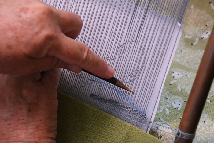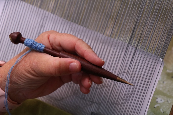 You will pick up weft threads with your non-dominant hand and use your dominant hand to pass the bobbin through the shed you have created, putting the head of the bobbin in first. Keep the bobbin in your dominant hand as it exits the shed.
