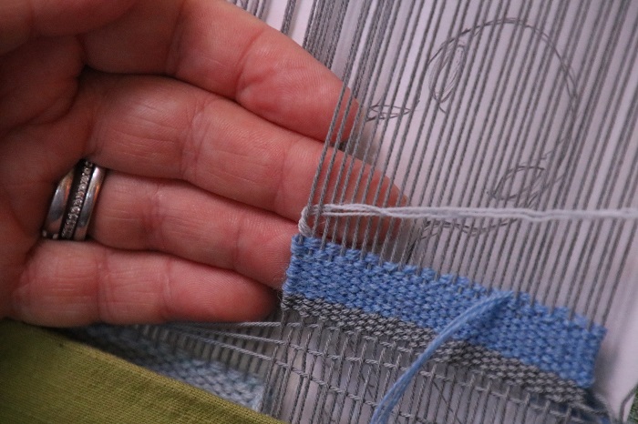 I am holding the open shed in this photo, and it matches the weaving in the shed that goes from right to left. Therefore, to start a second bobbin, I need to weave left to right in the open shed in order to be going in the opposite direction. To do that I will start my 2nd bobbin on the left side of my warp and weave in the open shed toward the right.