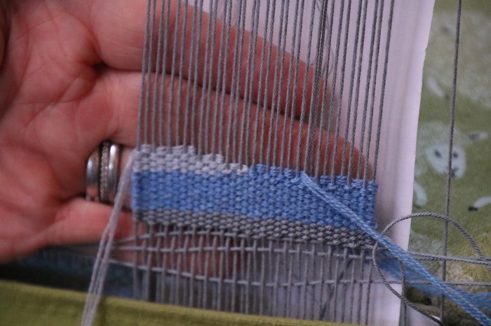 I’ve seen students hold the bobbin as they would hold a pen or a pencil. When you use the bobbin to beat in the weft in this position it is far less effective. It is a weak way to beat in the weft. Do not hold the bobbin this way!