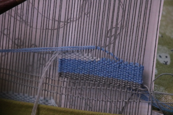 Here you can see the first pick of the next pass of the dark color. The weft is on an angle, not bubbled (!), and I will beat it in place with the bobbin in my dominant hand.