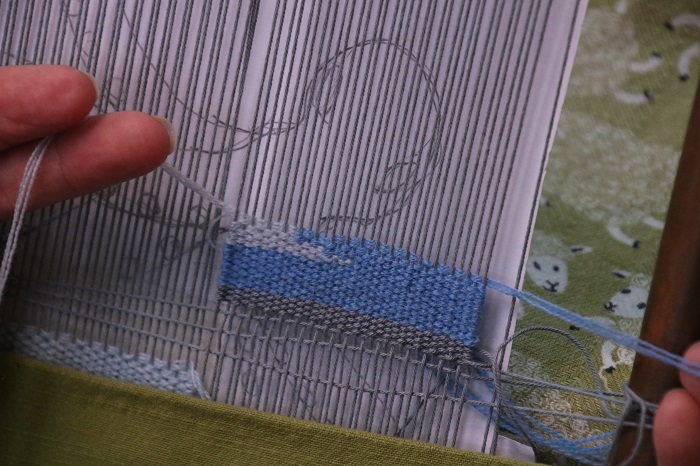My initial weaving was done in the open shed with the bobbin going right to left. Your loom may not have an open and closed shed, but you can check which shed you used to weave with the first bobbin. You need to go in the opposite direction with the second bobbin in that same shed.