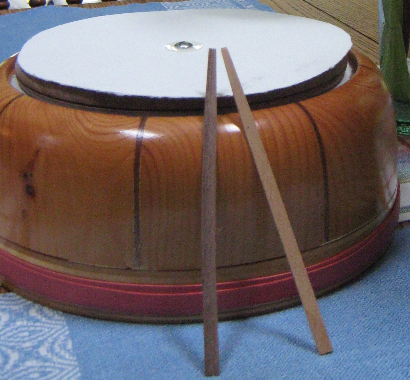 Next, I added one section of maple staves. The contrast between the walnut and maple will be greater when the staves dry.
