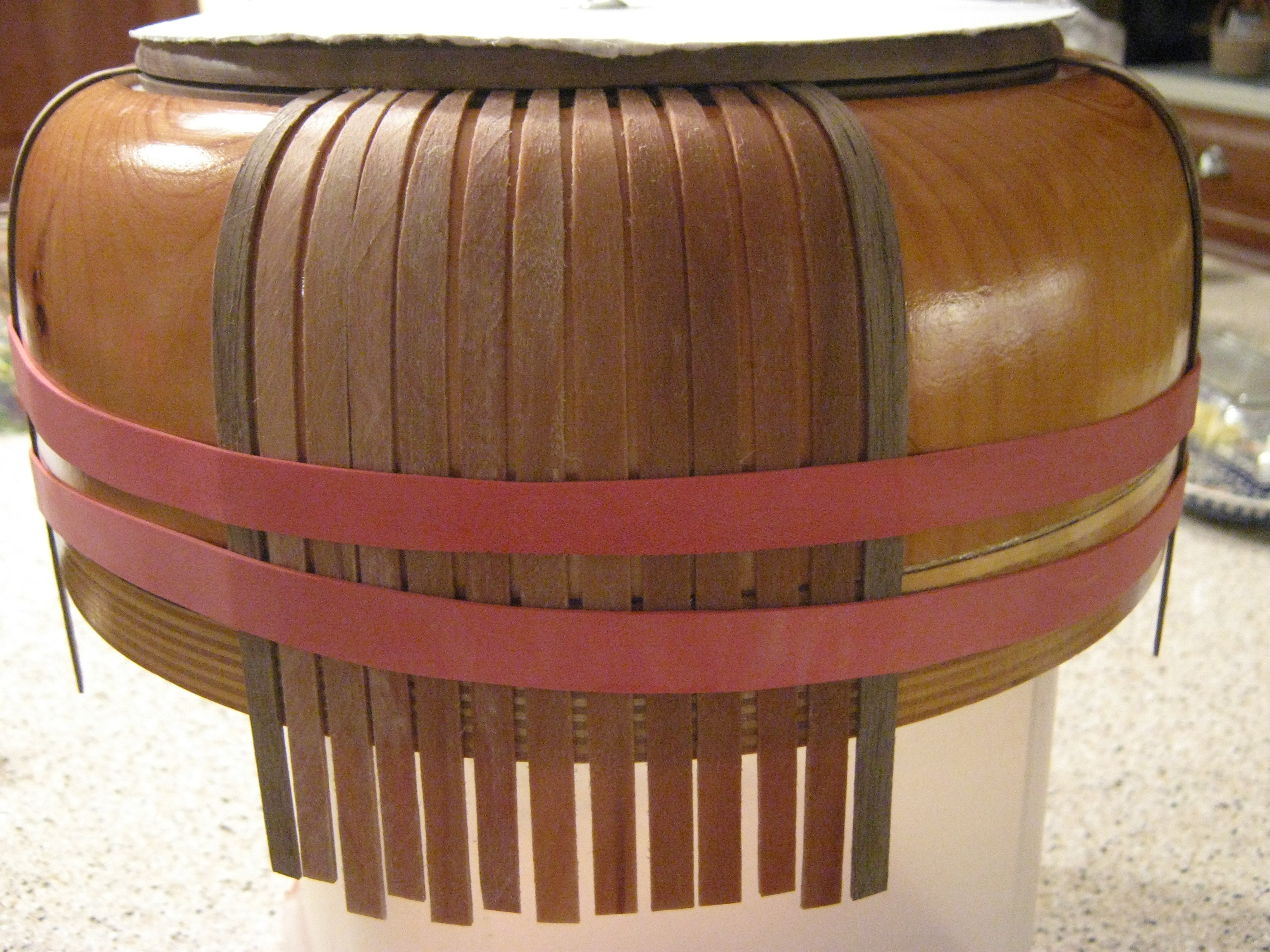 Preparing the mold: The hardwood on the base of the mold becomes the base of a Nantucket basket, with all the staves firmly attached into a groove. This base needs to be protected during the basket making process. I have removed the screw holding the base to the mold and inserted layers of cardboard that were cut to the same circumference as the base. I have two layers of cardboard between the base and the mold, and one layer of cardboard on the outside of the base to protect it while I’m weaving. I put the screw through all these layers and re-attached everything to the mold. Ready for inserting staves!