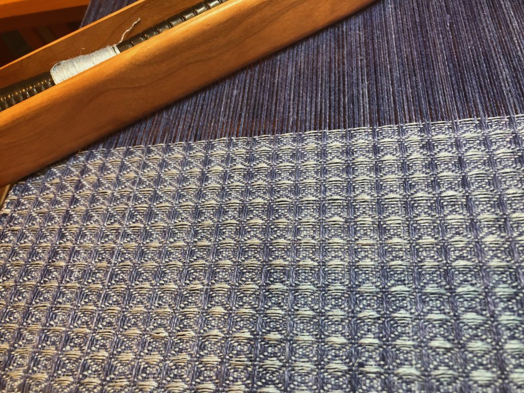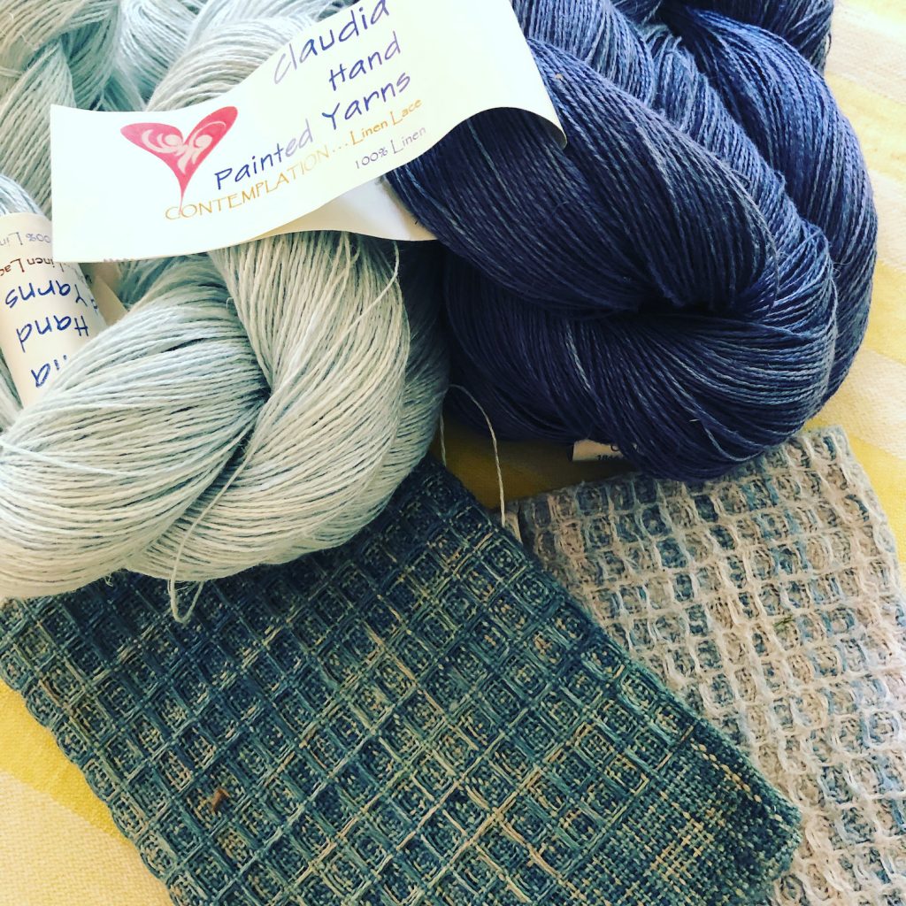 I wove two sets of waffle weave face cloths (for a total of 10), based on two I bought from Are Clothes Modern weaver Arianna Funk. Her face cloths are done in Swedish 5S waffle weave, with hand dyed indigo warps that a friend of hers dyed for her. I was lucky to find two colorways of indigo dyed linen from Claudia Hand Painted Yarns this summer. One is very pale and the other quite dark. I wove the pale indigo warp in 8S waffle weave. I love them! I thought I might tie on the dark indigo warp to weave the same structure, but in the end I decided to warp and rethread for a 6S waffle weave.